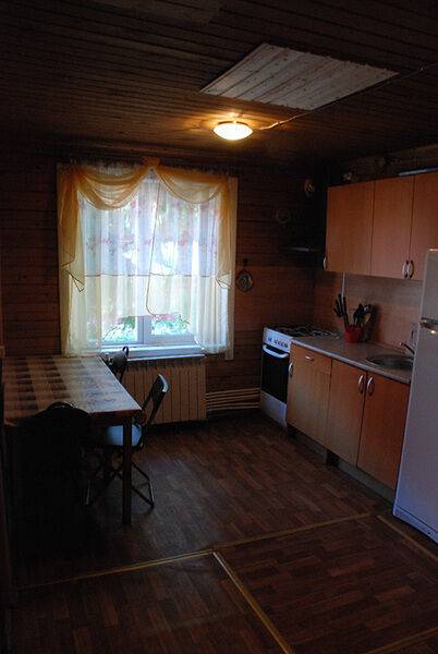 Первый этаж: Кухня с газовой плитой, эл. чайник, холодильник, СВЧ, набор посуды. Так же три спальни с 2-х спальными кроватями, каминная комната с двумя разборными 2-х спальными диванами и телевизором. Душевая и туалет.