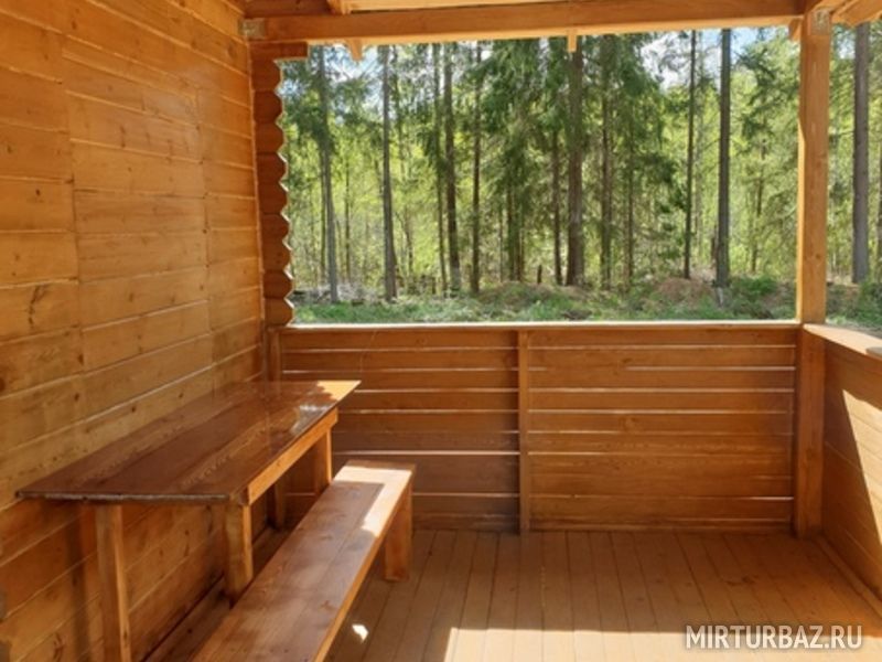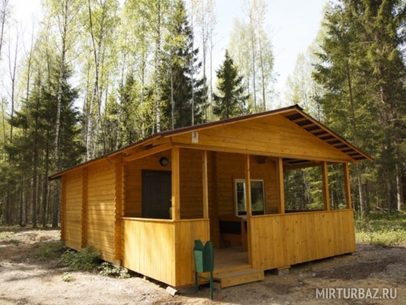 Гриль-домик с террасой на открытом воздухе, зона отдыха и мангальная площадка для проведения корпоративного отдыха, тимбилдинга на 18-25 человек. Расположен на берегу озера, среди густого ельника. Внутри домика — очаг с живым огнем.
