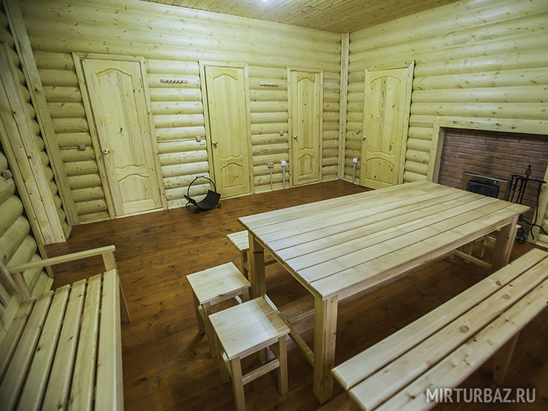 - просторный предбанник с камином и большим столом для дружеских посиделок