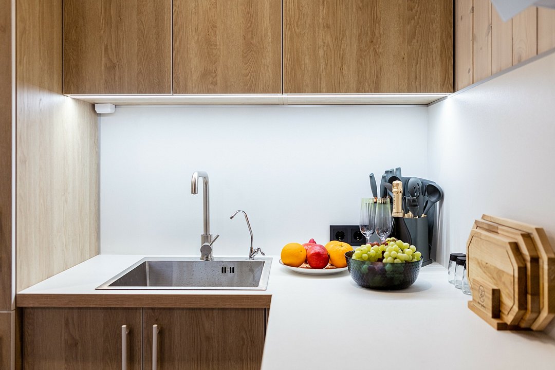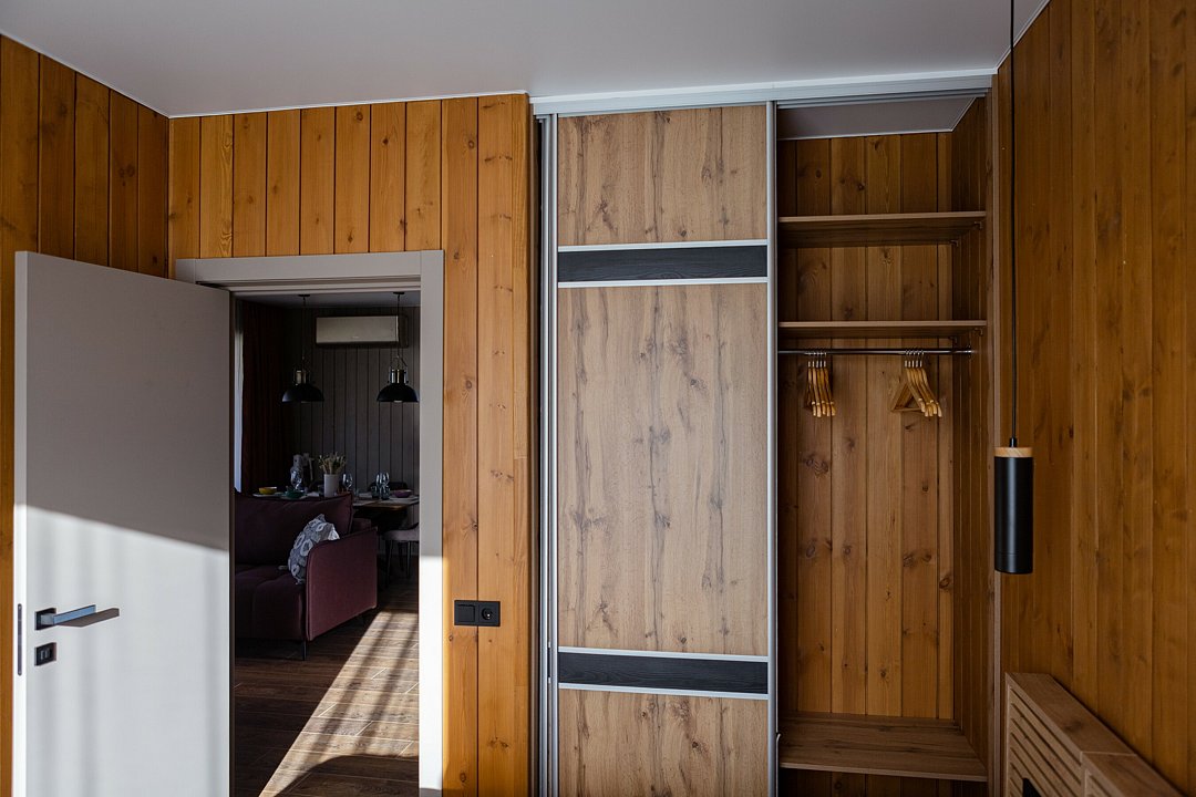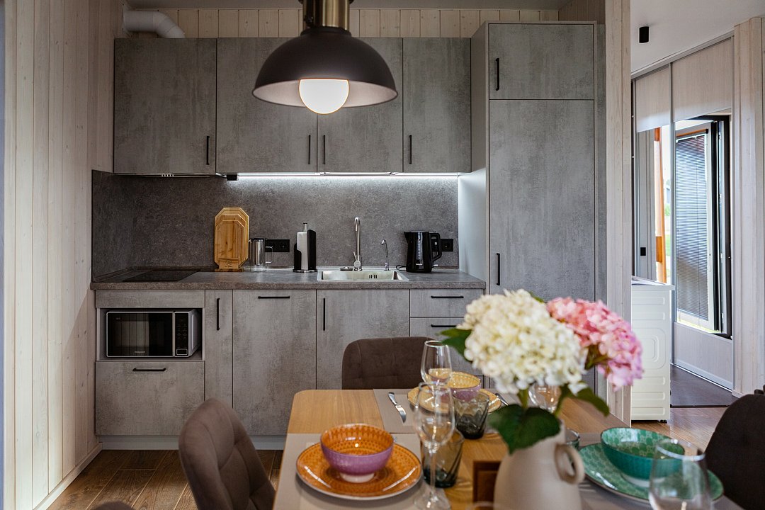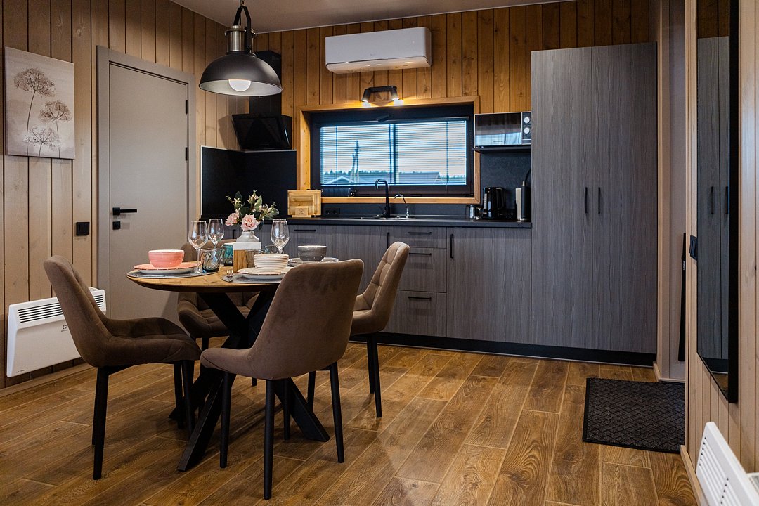 Внутри полный комплект удобств: электрическое отопление и кондиционер для любого сезона, стиральная и посудомоечная машины, холодильник, плита, микроволновка, телевизор со Smart TV, Wi-Fi. Чистое постельное бельё, полотенца и средства гигиены уже готовы. Горячая вода, канализация, водонагреватель, фен, утюг — всё на месте, без квестов и сюрпризов.