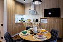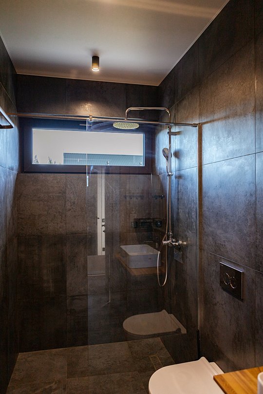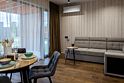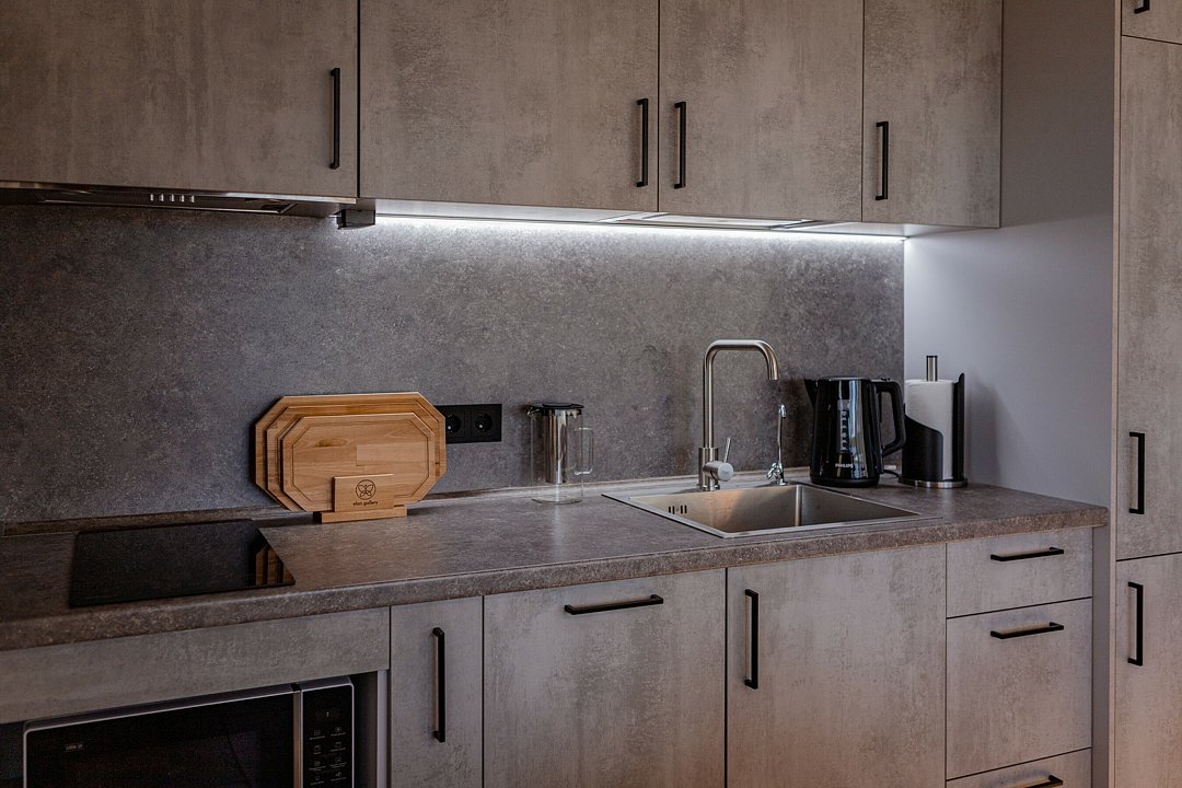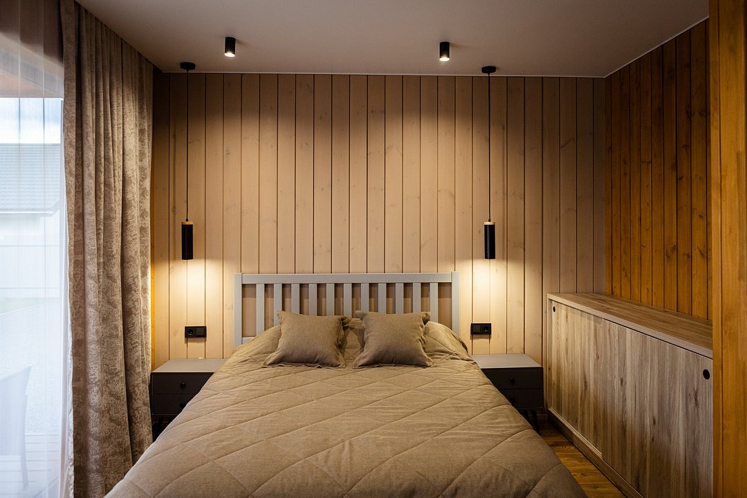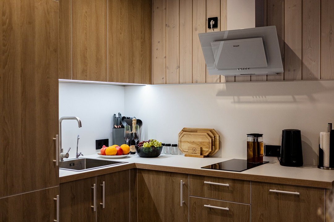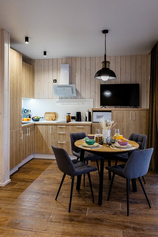 Внутри полный комплект удобств: электрическое отопление и кондиционер для любого сезона, стиральная и посудомоечная машины, холодильник, плита, микроволновка, телевизор со Smart TV, Wi-Fi. Чистое постельное бельё, полотенца и средства гигиены уже готовы. Горячая вода, канализация, водонагреватель, фен, утюг — всё на месте, без квестов и сюрпризов.