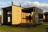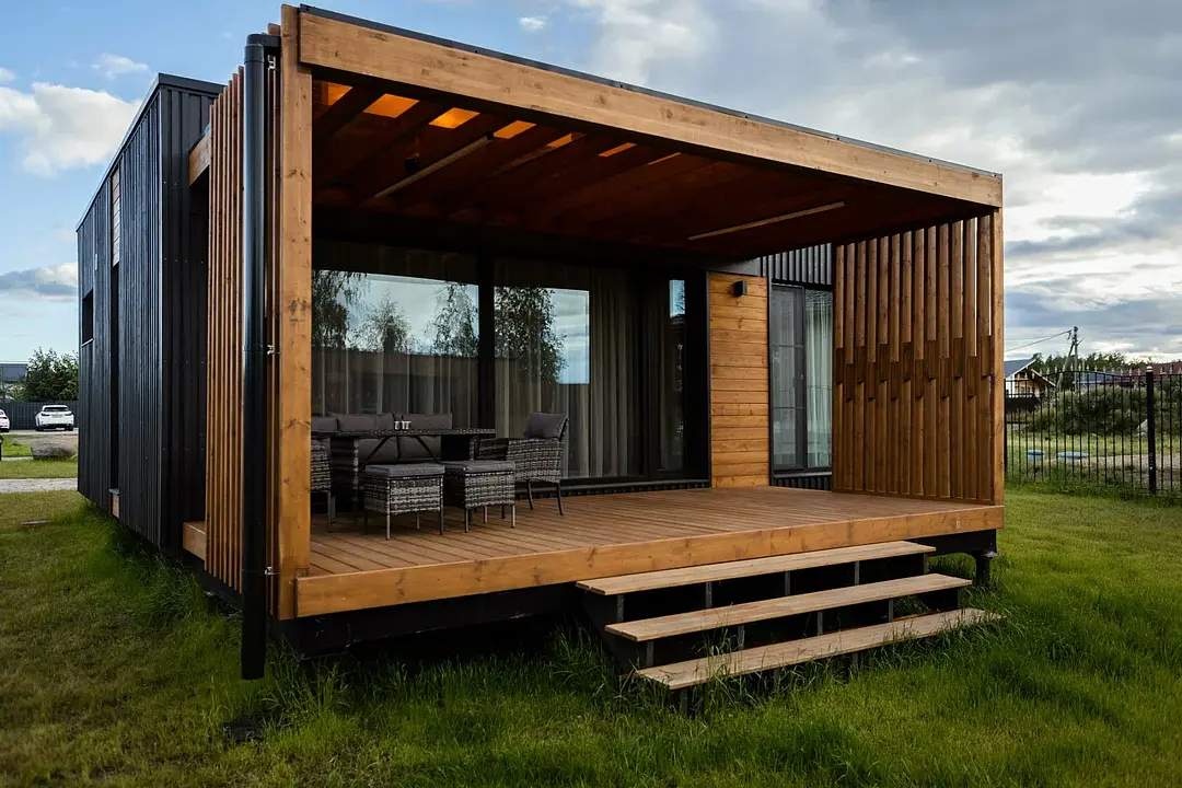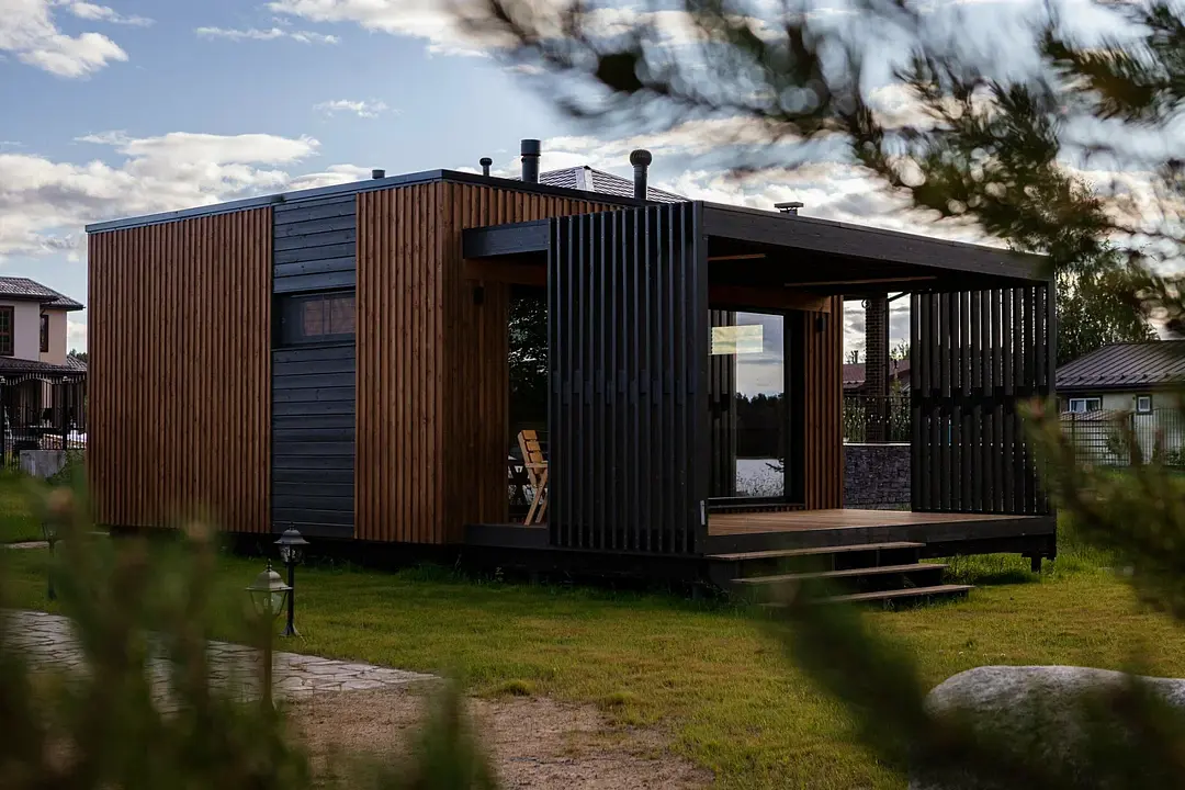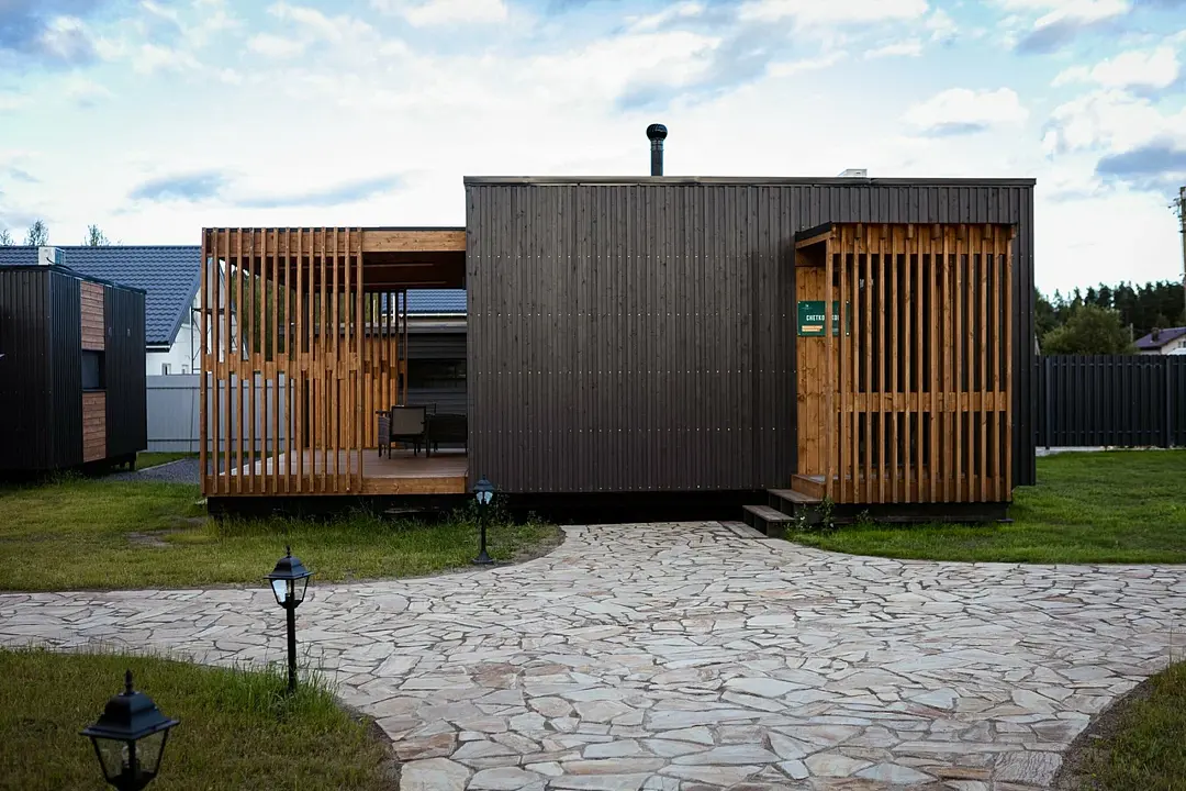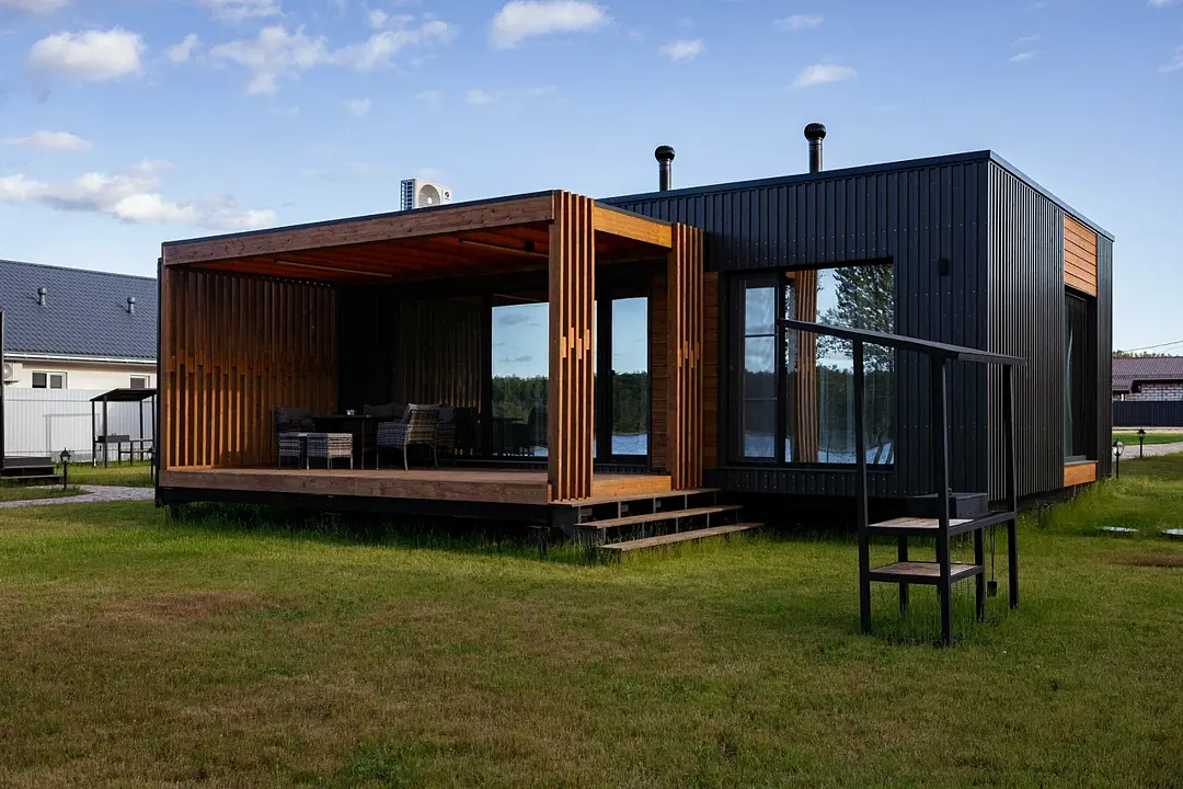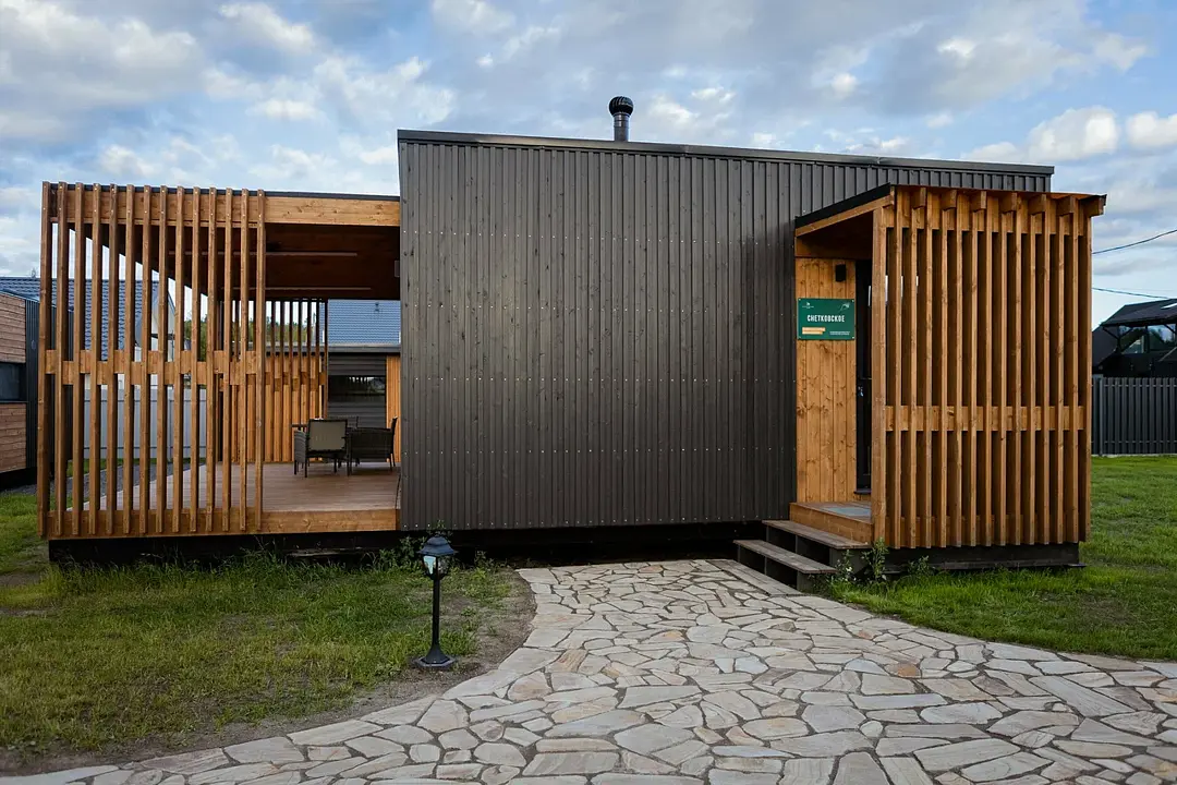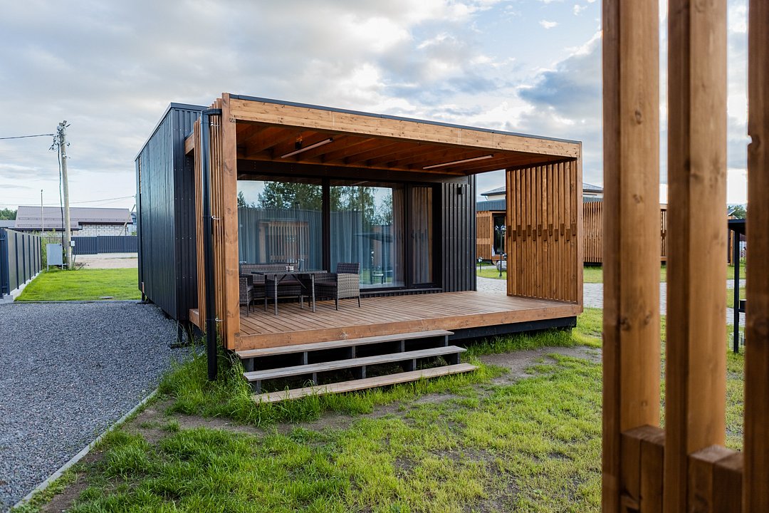 Просторная кухня-гостиная с раскладным диваном становится центром притяжения: завтрак с видом на участок, настольные игры вечером, разговоры, которые внезапно затягиваются до заката. Раздельный санузел внутри добавляет бытового удобства, чтобы отдых не превращался в логистику.