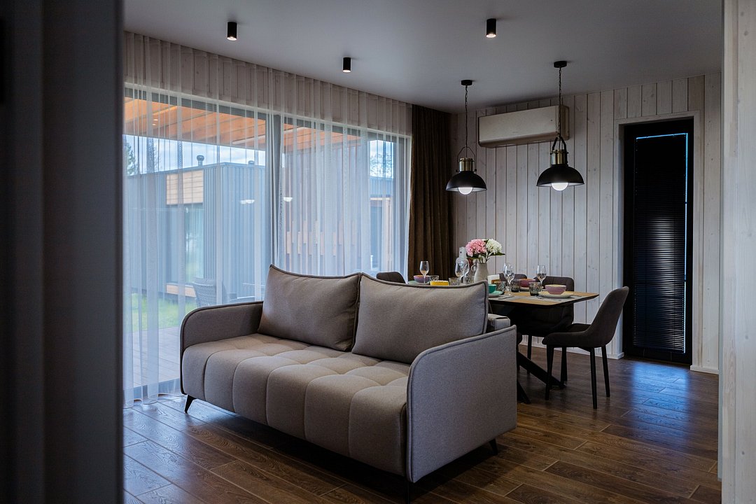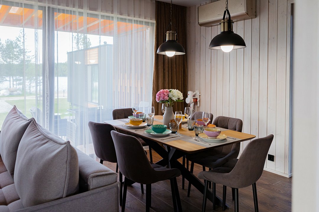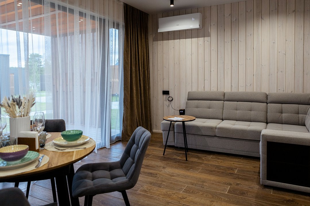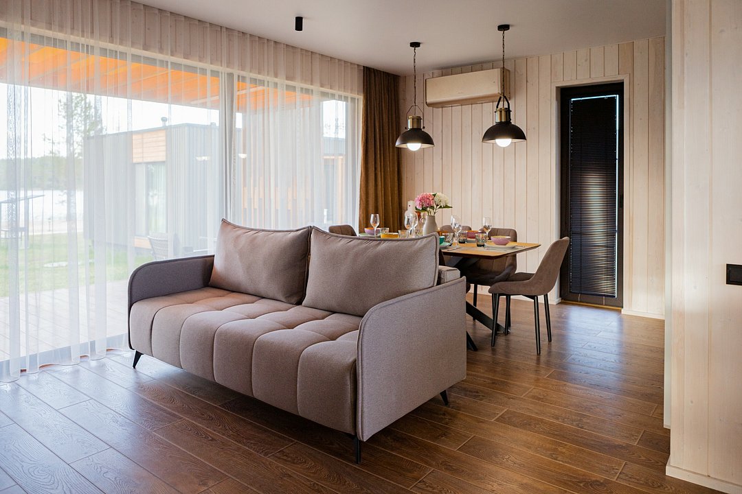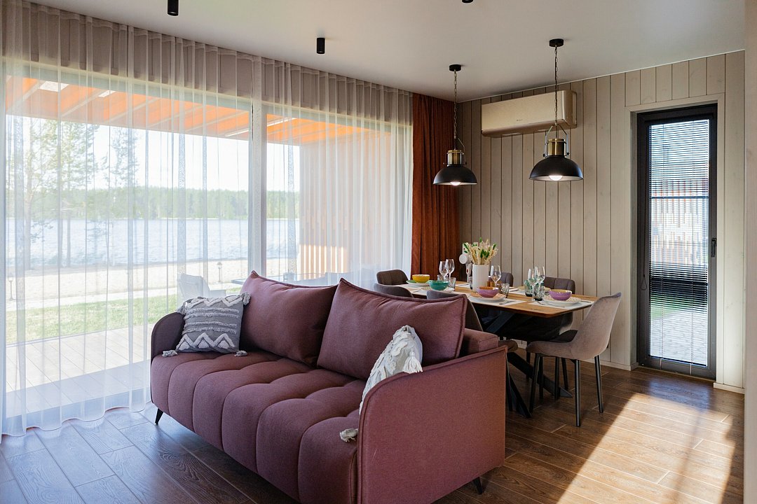 Просторная кухня-гостиная с раскладным диваном собирает всех за одним столом, а отдельная спальня с двуспальной кроватью и дополнительным диваном позволяет разместиться до 4 гостей без ощущения «чемодан на чемодане». Терраса с садовой мебелью становится летней столовой, переговорной и площадкой для вечерних разговоров под озёрный закат.