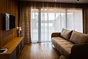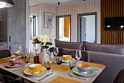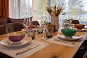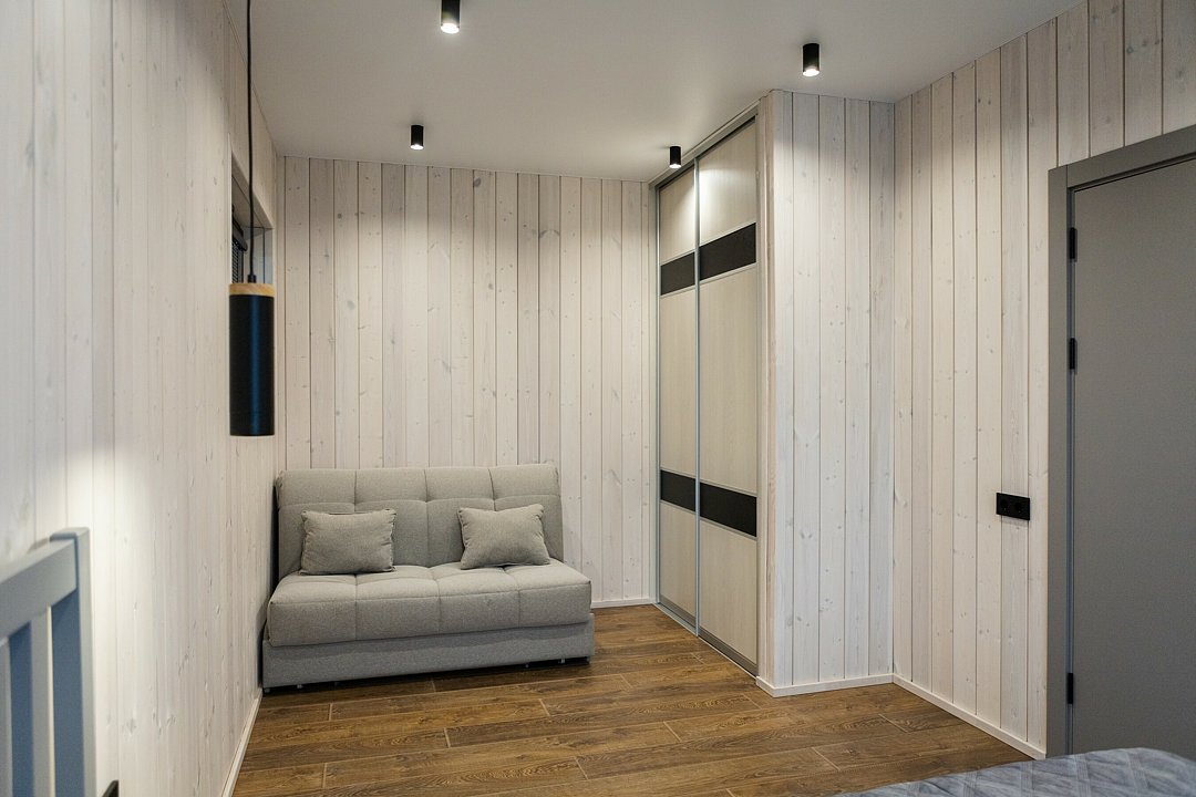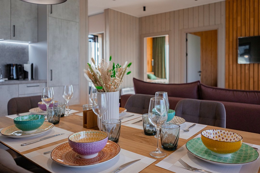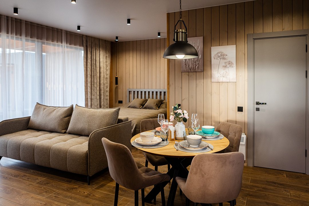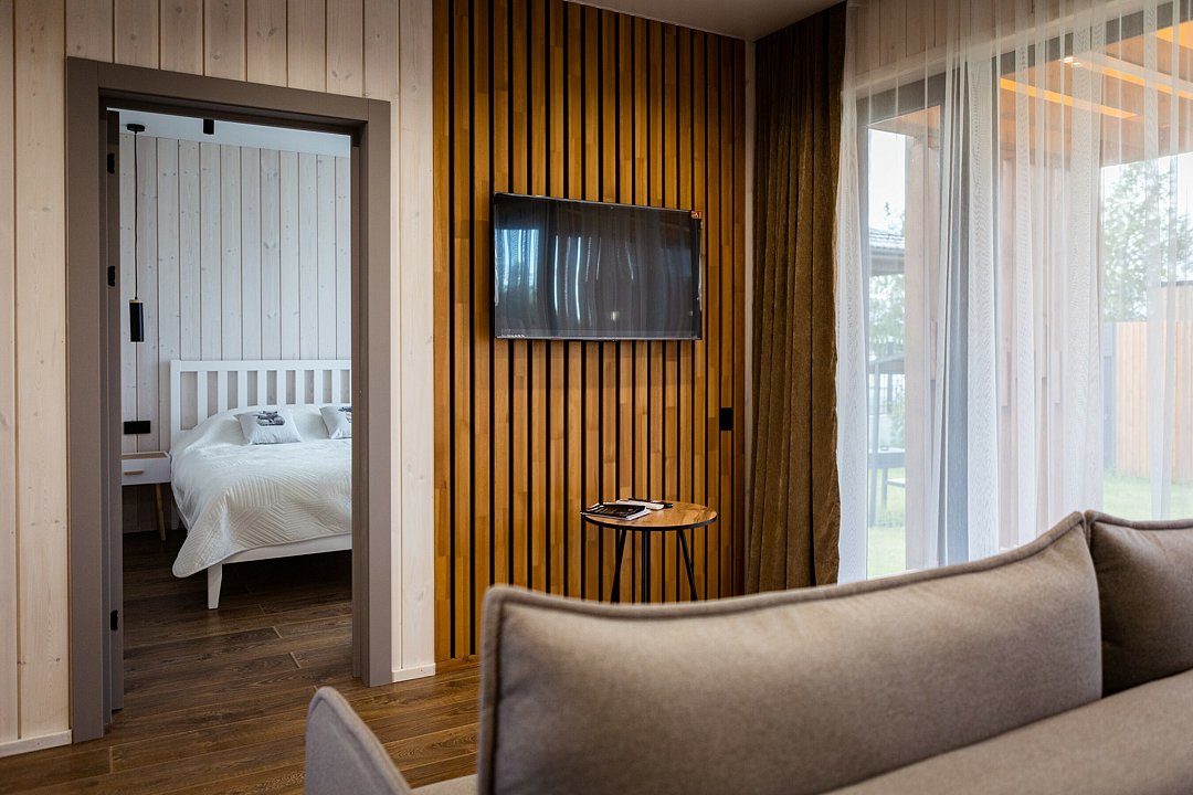 Просторная кухня-гостиная с раскладным диваном собирает всех за одним столом, а отдельная спальня с двуспальной кроватью и дополнительным диваном позволяет разместиться до 4 гостей без ощущения «чемодан на чемодане». Терраса с садовой мебелью становится летней столовой, переговорной и площадкой для вечерних разговоров под озёрный закат.