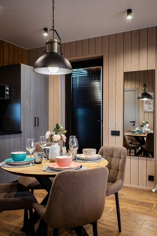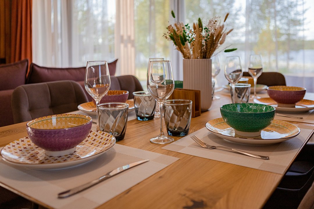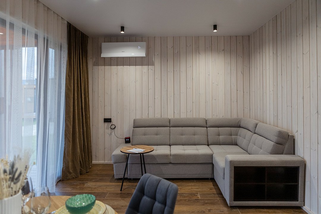 Внутри тепло круглый год благодаря электрическому отоплению и кондиционеру с режимами на зиму и лето. Полный набор техники: холодильник, плита, микроволновка, посудомоечная машина, телевизор со Smart TV, фен, утюг. Есть Wi-Fi, телевидение и все коммуникации, включая горячую воду и канализацию. Чистое бельё, полотенца и средства гигиены уже ждут гостей, как аккуратно сложенный комплимент.