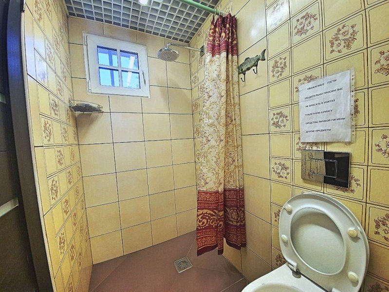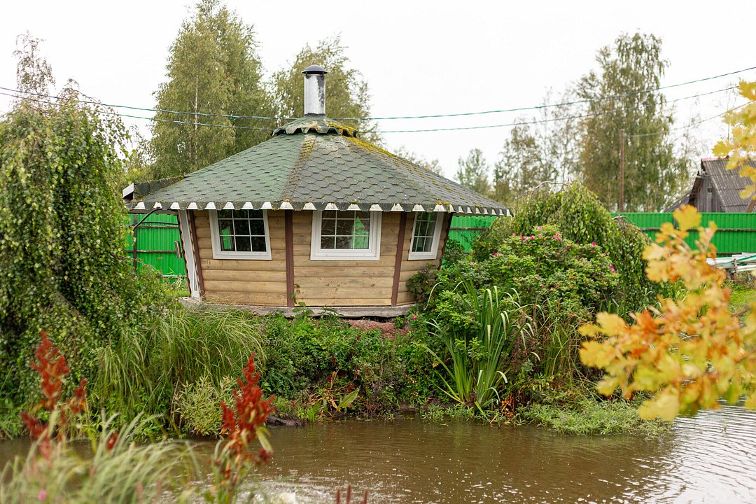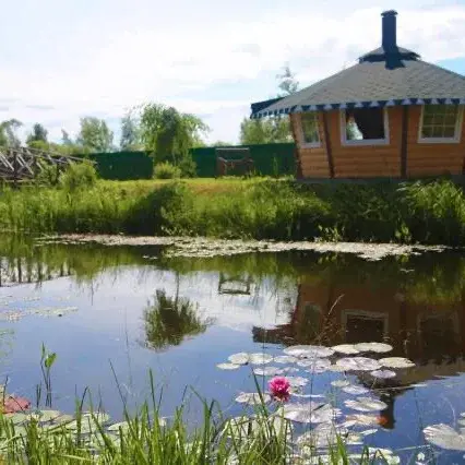 Беседка у берега пруда рассчитана на восемь человек. Внутри стоят два стола и мангал, что делает ее идеальной для пикника или дружеской встречи. Гостям предлагается арендовать беседку целиком или только половину, что удобно для групп из четырех человек.