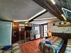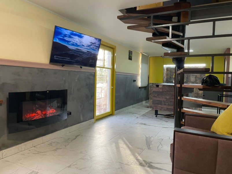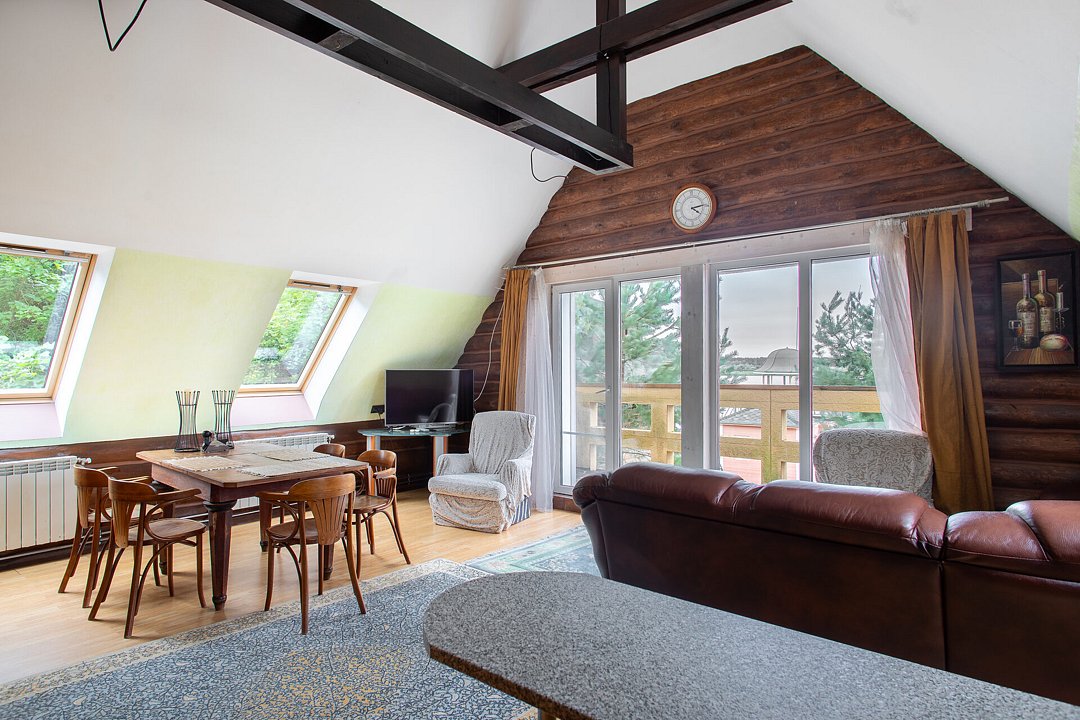 VIP-коттедж отличается увеличенной площадью — сто тридцать квадратных метров, что позволяет гостиной на втором этаже стать идеальным местом для отдыха большой дружной компании.