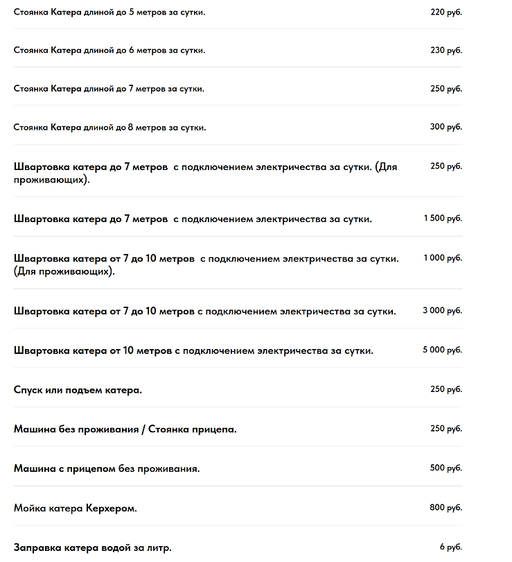 Гостям доступны как краткосрочные пришвартовки, так и длительное хранение, включая зимнее, а также комплекс сервисных работ — спуск и подъем катеров, мойка, швартовочные работы и прочие услуги по обслуживанию судов.