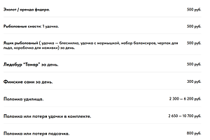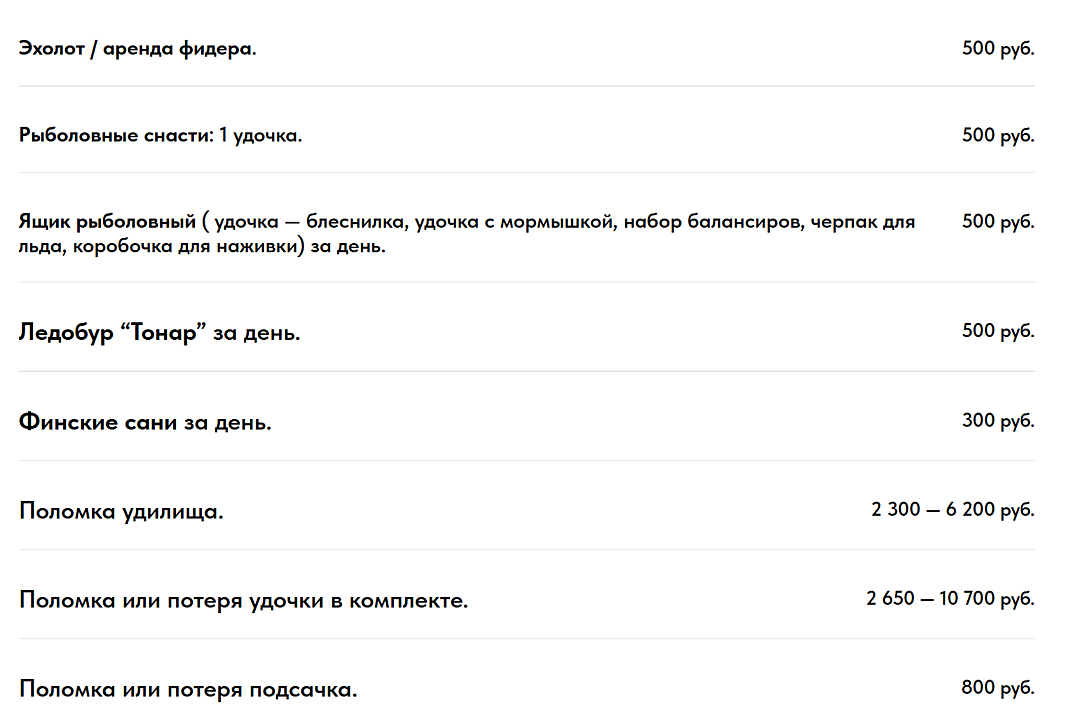 В услугу входит доставка к лункам на аэролодке, утепленное укрытие с теплым полом, теплообменником, освещением и мебелью, прикормленные лунки, помощь и советы гида с инструктажем по оборудованию, а при необходимости — снасти, насадки и прикормка.