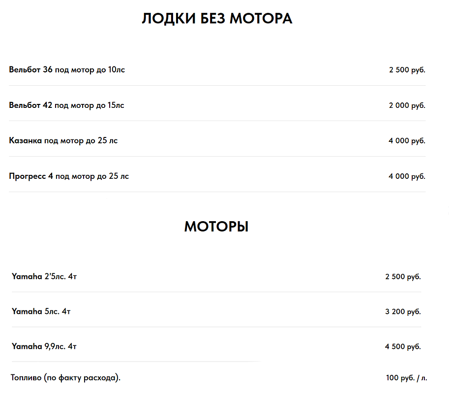 - для джига и донной снасти — катер «Buster S» с мотором Yamaha 40 и различным оборудованием (вмещает двух рыболовов и гида).