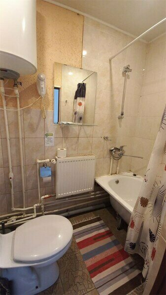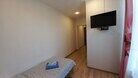 В номере две односпальные кровати, телевизор, шкаф, тумба, туалетные принадлежности. Душ и туалет в номере.