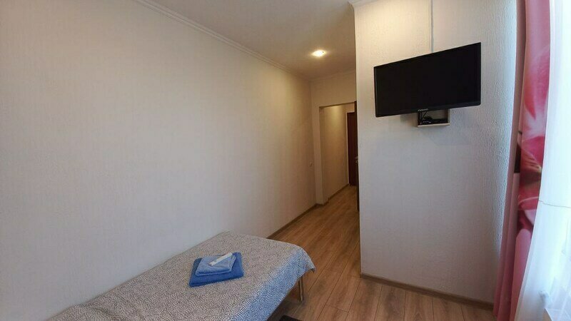В номере две односпальные кровати, телевизор, шкаф, тумба, туалетные принадлежности. Душ и туалет в номере. В номере есть верхний свет, ТВ с эфирным телевидением.