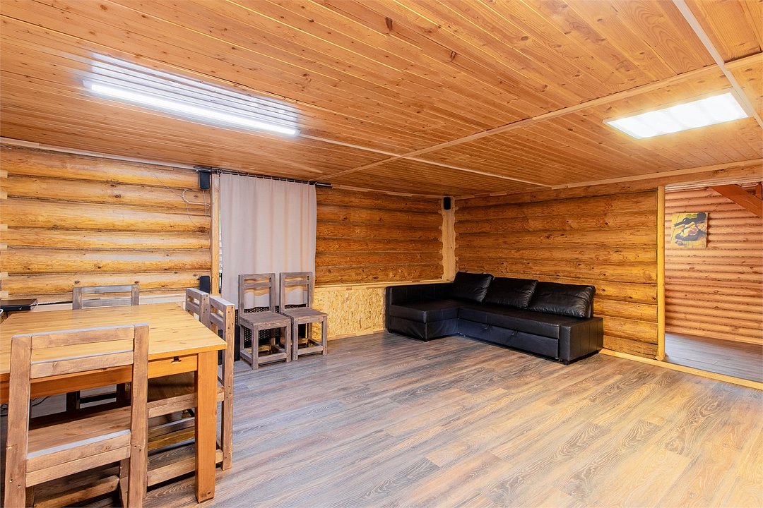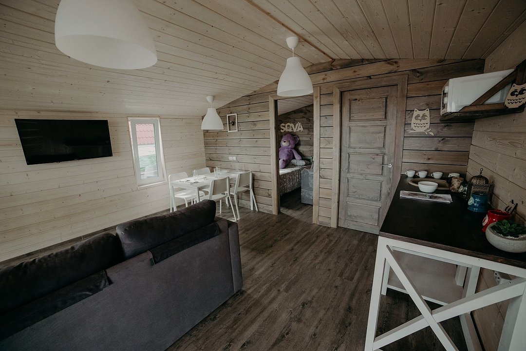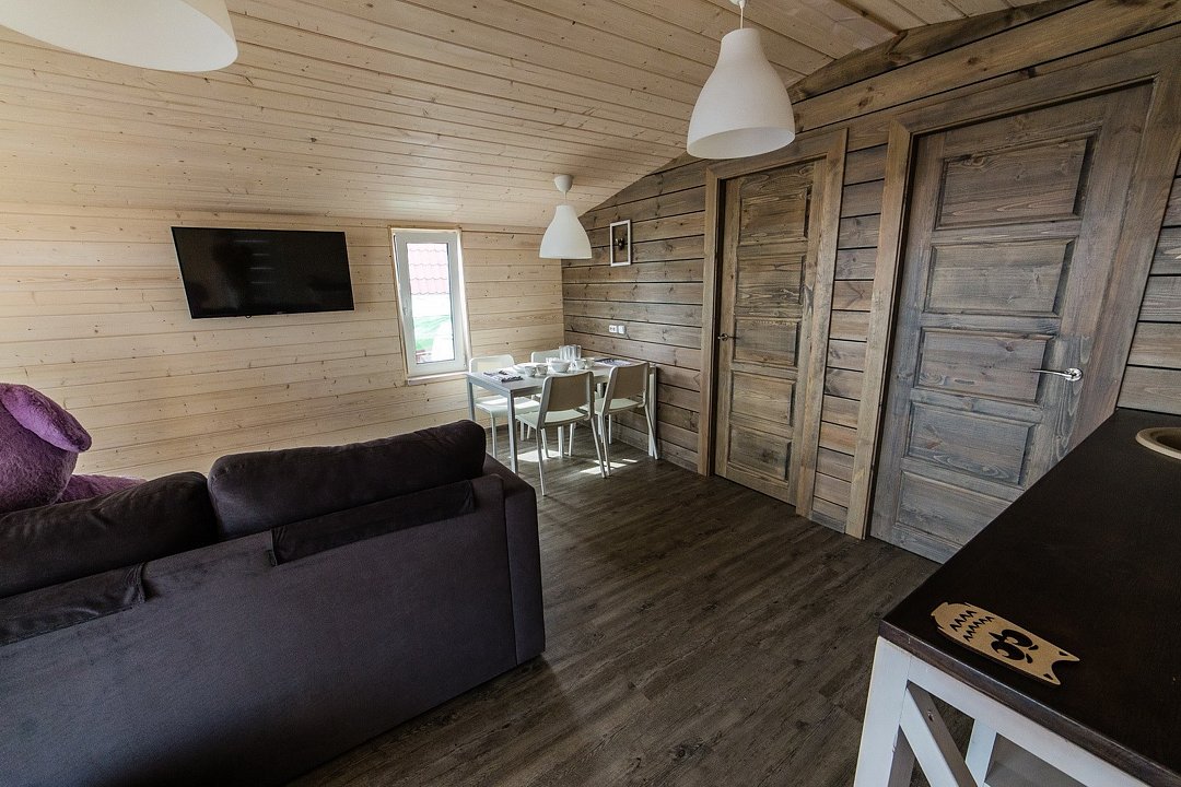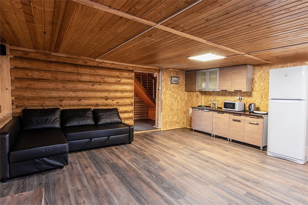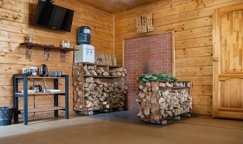 Бревенчатый дом: на первом этаже — просторный зал-столовая, раскладной диван-кровать, на втором этаже 2 спальни, туалет + душевая. На территории дома зона отдыха с деревянной мебелью и мангал под крышей, Wi-Fi.