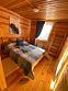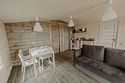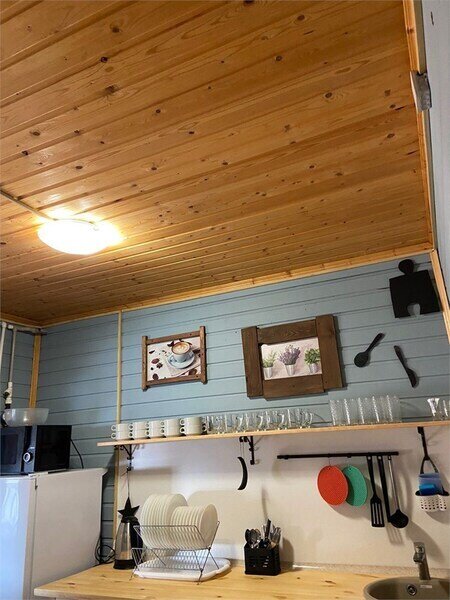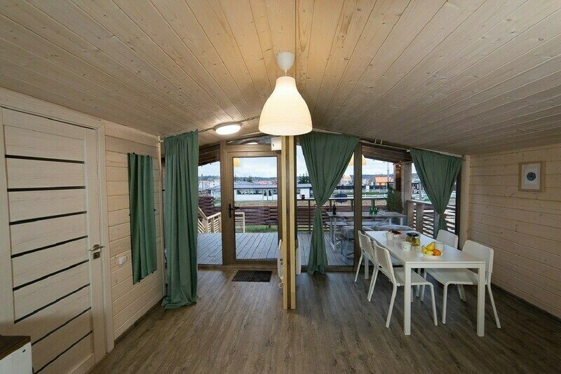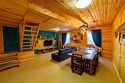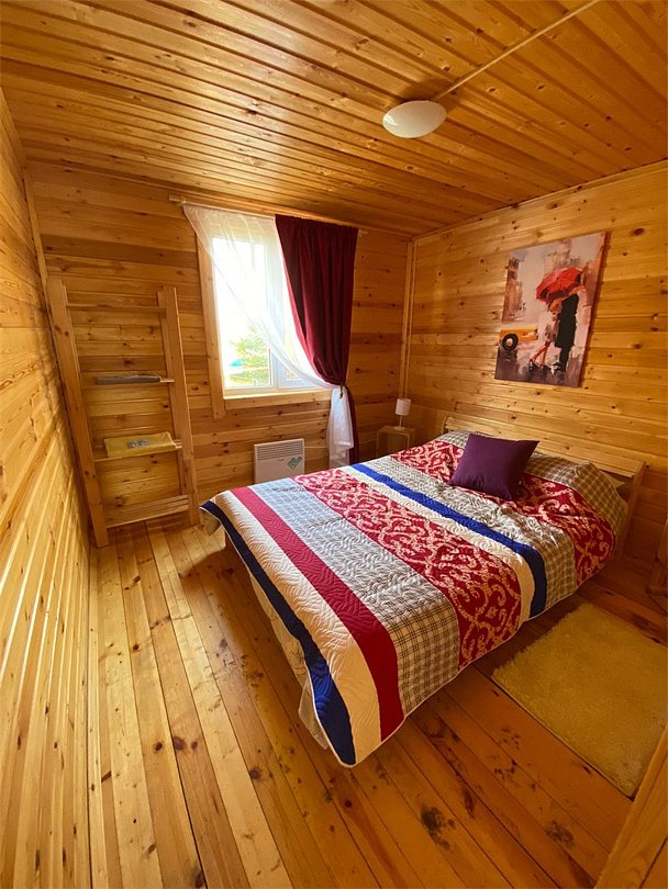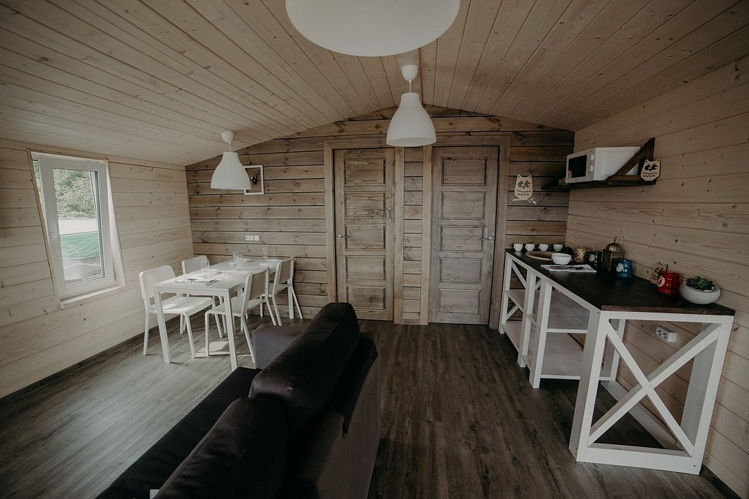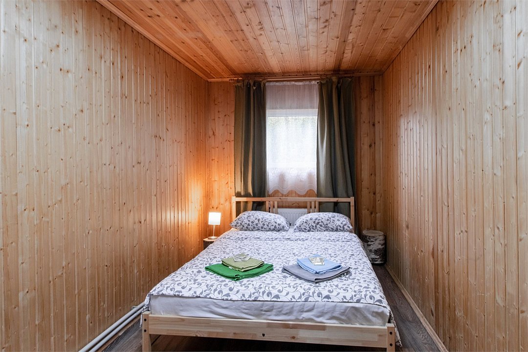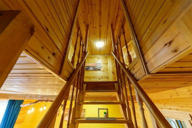 Бревенчатый дом: на первом этаже — просторный зал-столовая, раскладной диван-кровать, на втором этаже 2 спальни, туалет + душевая. На территории дома зона отдыха с деревянной мебелью и мангал под крышей, Wi-Fi.