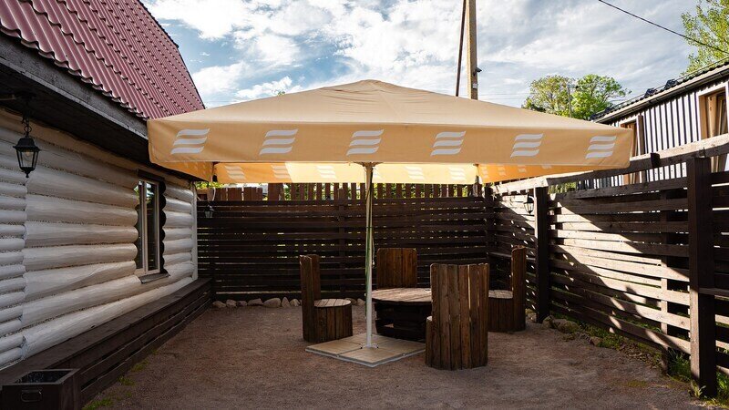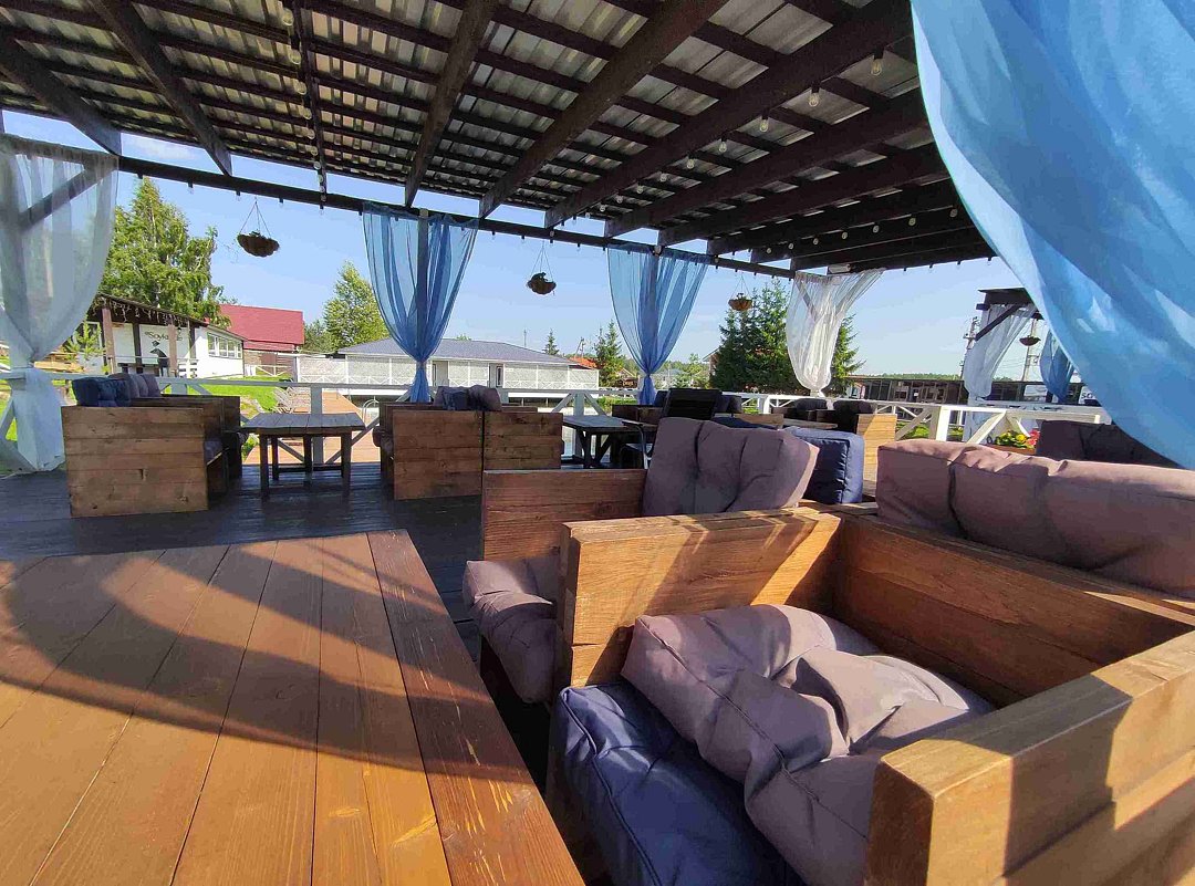 Крытая, отапливаемая беседка с зоной барбекю. Вместимость — до 8 человек. Меблирована, с электричеством. Предоставляются шампуры, скатерть, мангал.