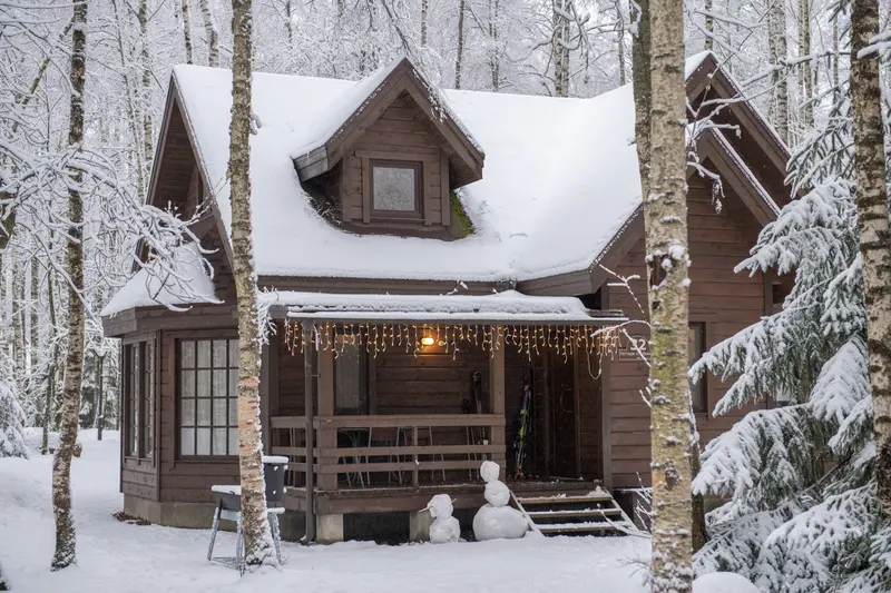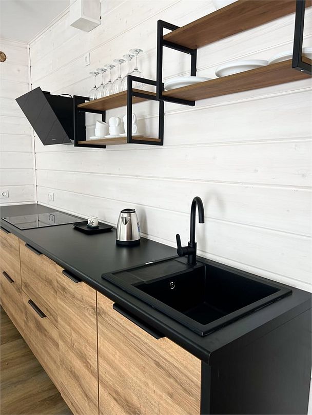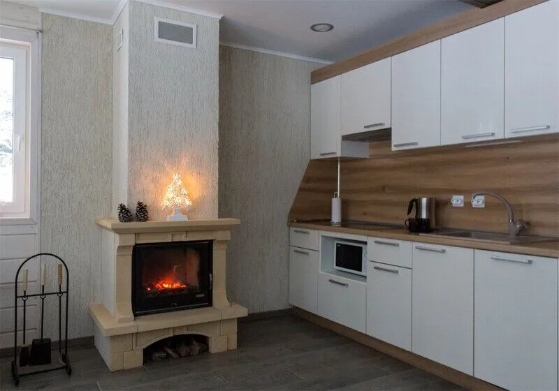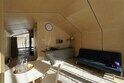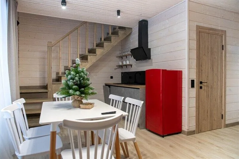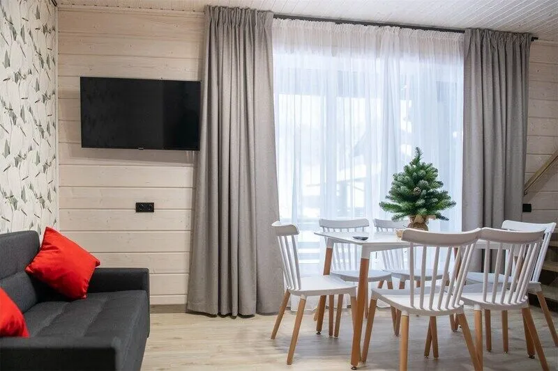 Красивый дом с панорамными окнами, небольшой кухней и уютной спальней. Расположен у подножия горнолыжных склонов. 600 метров до семейного ресторана «Ферма Троллей» с рыбалкой и веревочным парком, в 400 метрах от пляжа и вейк-станции.