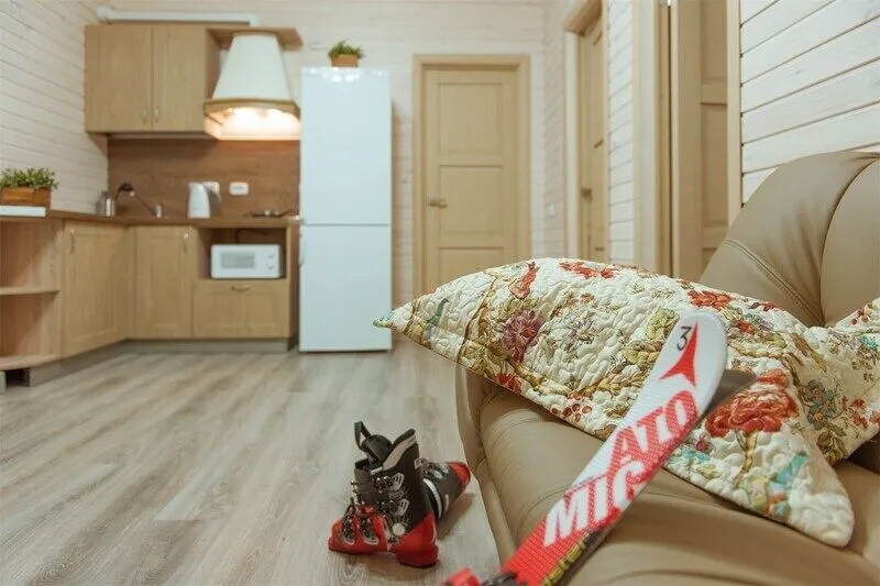 Вход в номера из коридора и с террасы. Общая сушильная комната и помещение для хранения лыж и сноубордов. В корпусе есть детская комната.