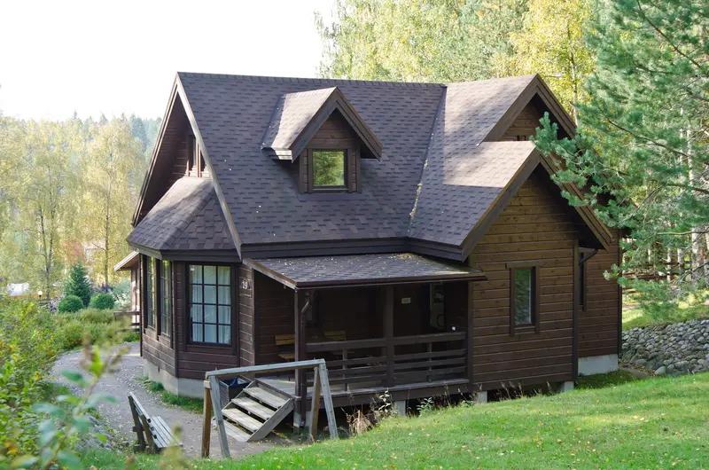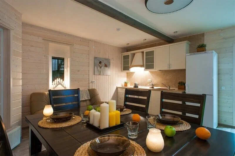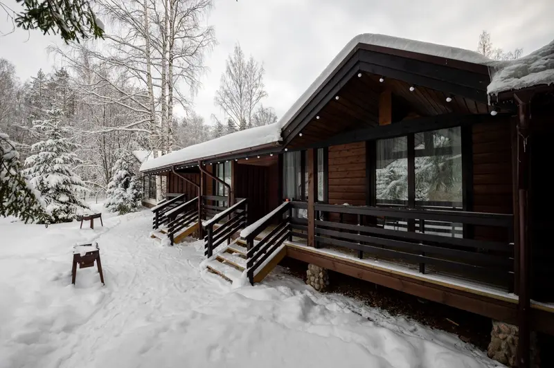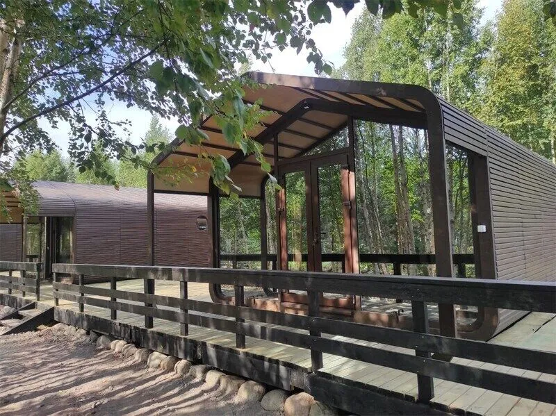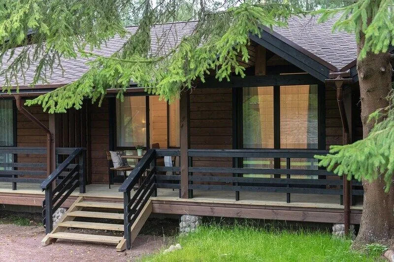 Уютные деревянные одноэтажные коттеджи финского типа с террасой.