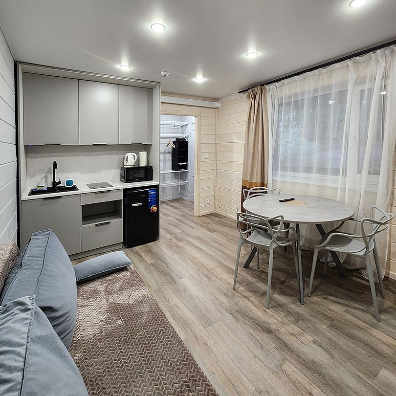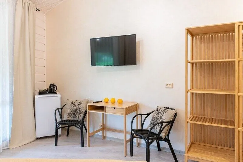 Однокомнатный двухместный номер с отдельным входом с улицы через террасу. В номере две кровати, сдвигающиеся в одну большую. Сушильный шкаф. Для детей до 3-х лет предоставляется детская кроватка бесплатно (по предварительному заказу). Допускается проживание с животными (за доп. плату).