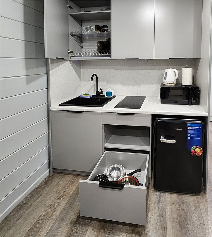 Дополнительное спальное место (раскладной диван), чайная станция, холодильник, фен, просторная ванная комната с душем.