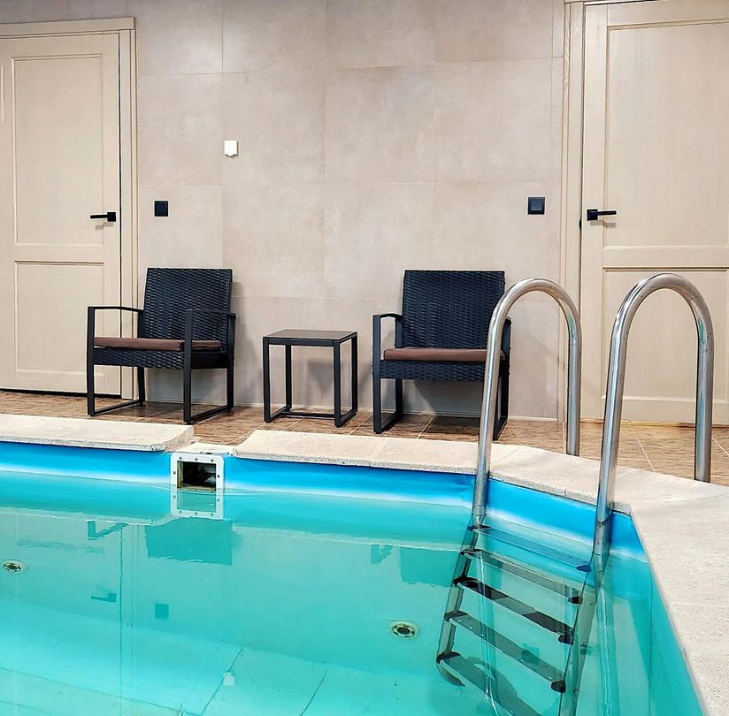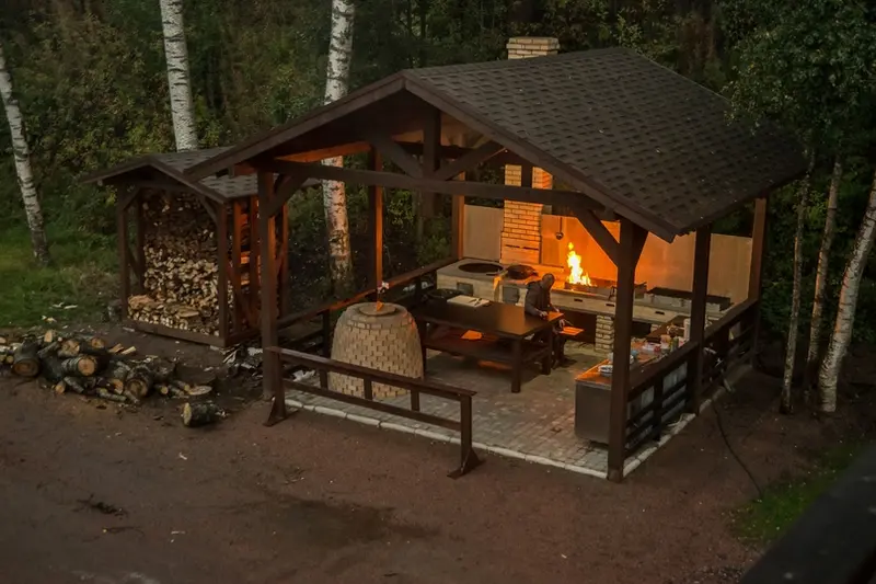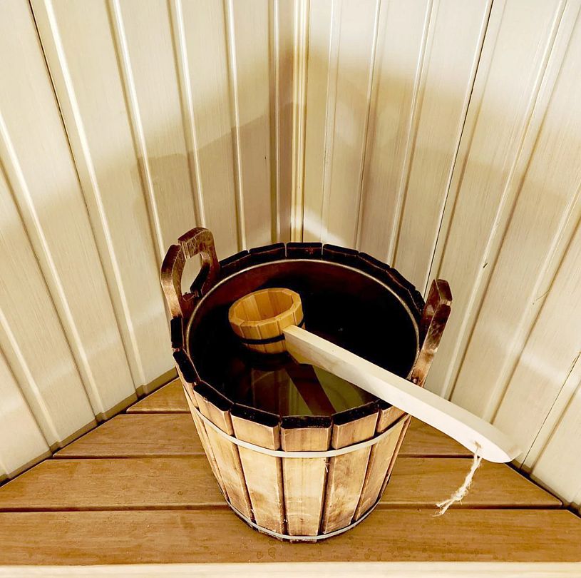 Баня растапливается исключительно на берёзовых дровах. Работают два отдельных отделения, каждое вмещает до 8–10 человек. Доступна круглосуточно по предварительному бронированию. На территории — общая прохладная купель для всех гостей.