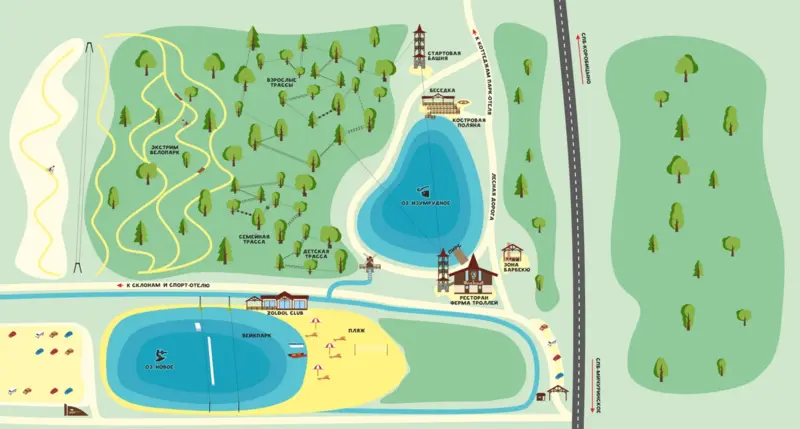 На территории курорта работают два ресторана с разными концепциями, пиццерия, гриль-бар, бургерная. Для гостей доступны озеро с рыбалкой, сертифицированный пляж с прокатом и многое другое. Всё это создаёт единый комплекс спорта, отдыха и гастрономических впечатлений.