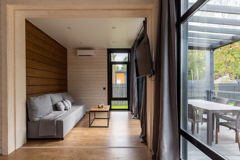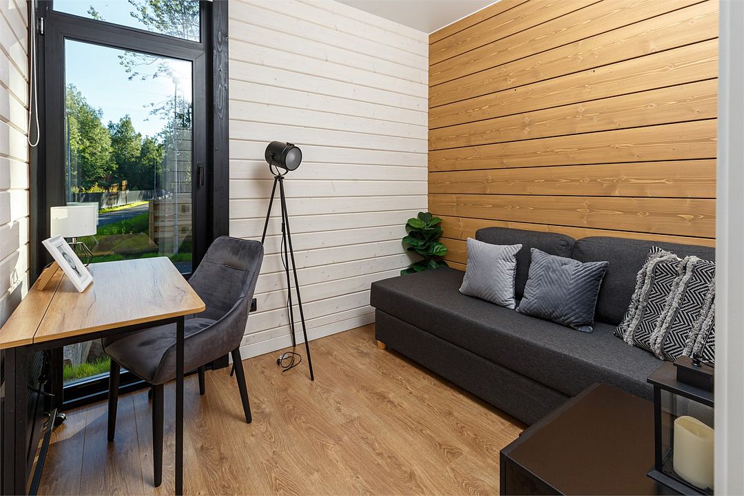 В вашем распоряжении просторная спальня с комфортной кроватью размера "king size" для полноценного отдыха, а также уютная гостиная с диваном, который может разместить двух дополнительных гостей. Дом полностью укомплектован посудой на четыре персоны и всем необходимым для приготовления пищи, включая капсульную кофемашину.
