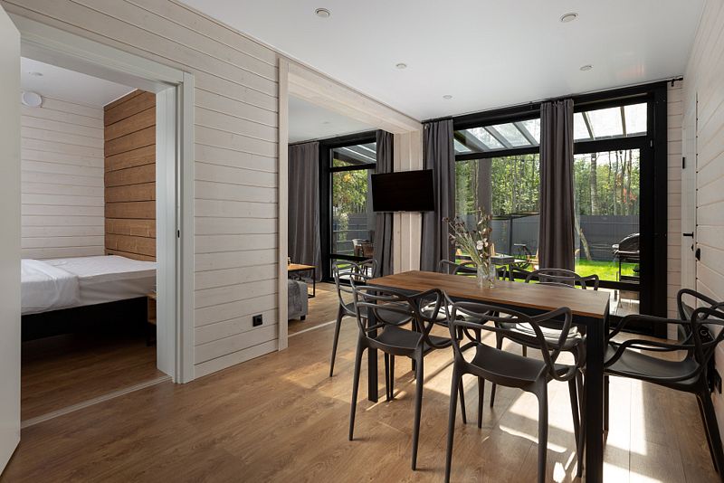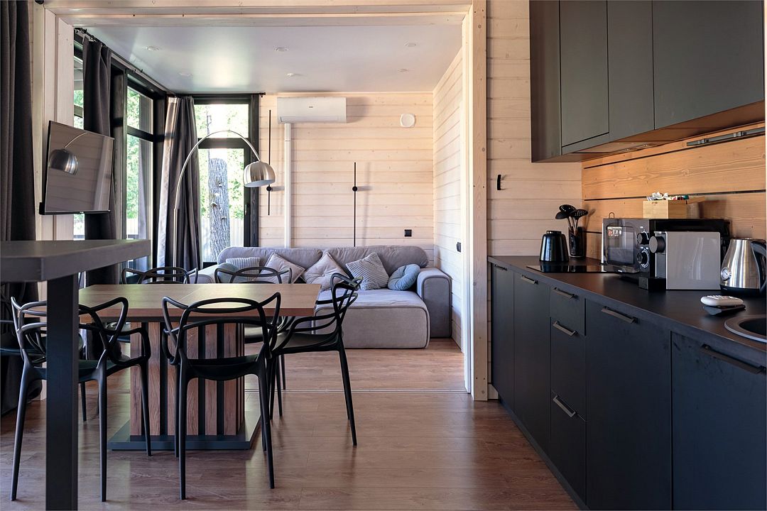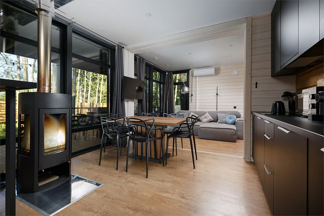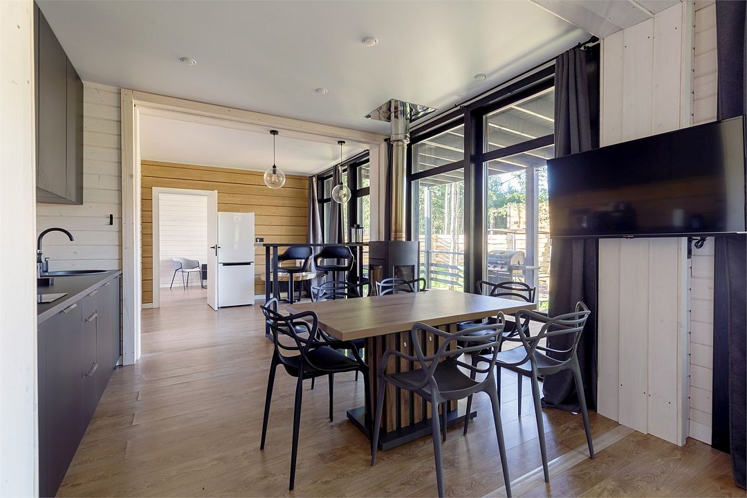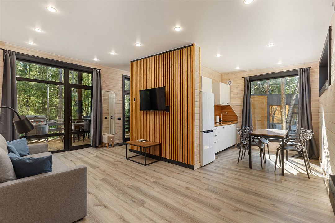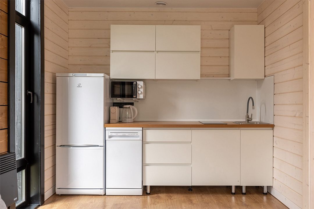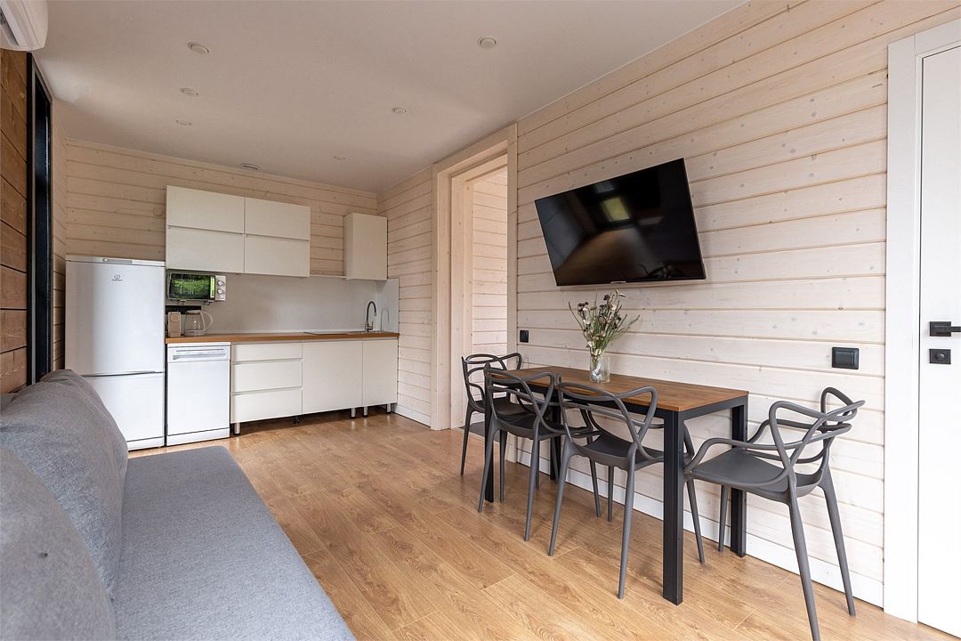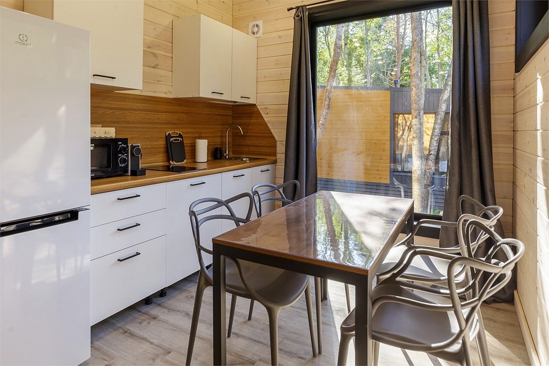 Коттеджи рассчитаны на компанию от 2 до 6 человек и обустроены с заботой о вашем комфорте. В просторной кухне-гостиной есть всё необходимое: холодильник, микроволновая печь, варочная панель и посудомоечная машина, а также полный набор посуды. Дополняют уют панорамные окна, наполняющие дом светом, тёплые полы и телевизор для вечернего досуга.