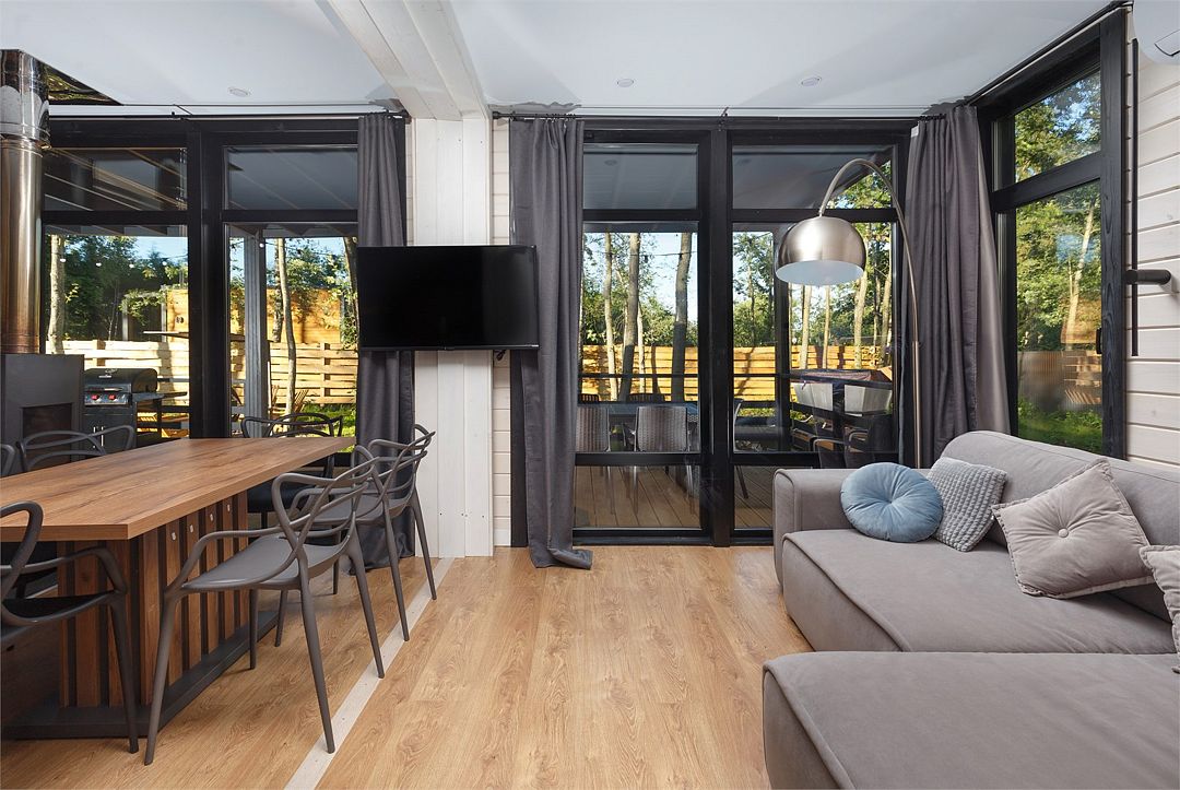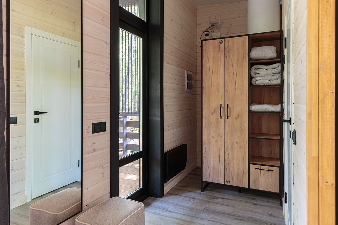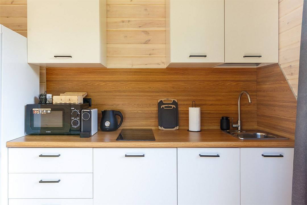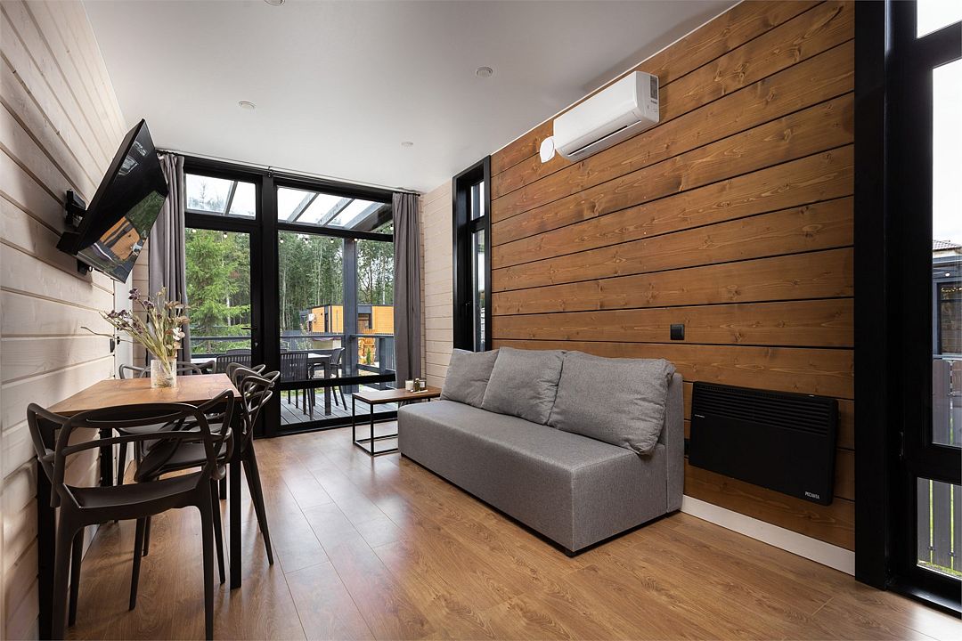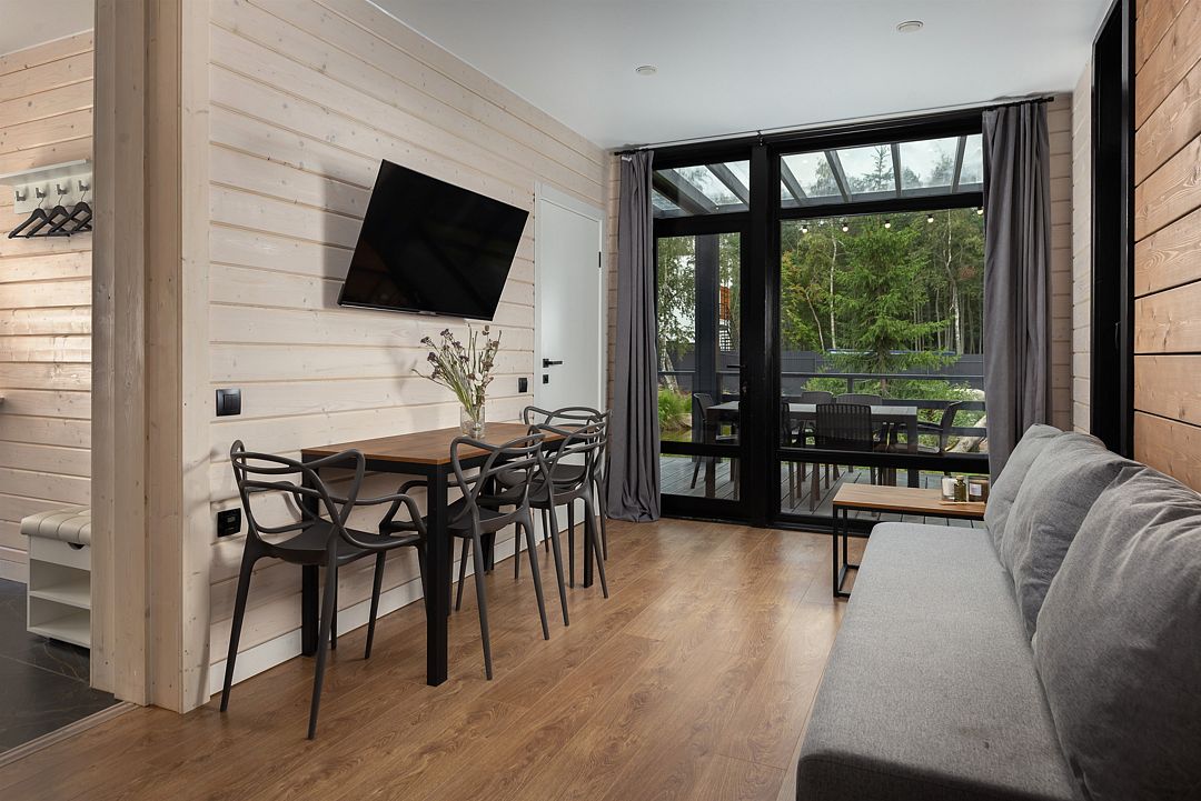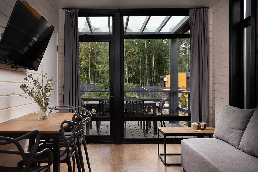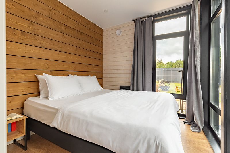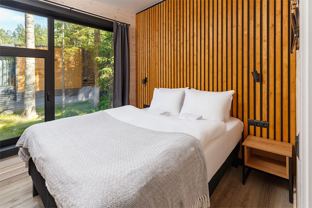 Коттеджи рассчитаны на компанию от 2 до 6 человек и обустроены с заботой о вашем комфорте. В просторной кухне-гостиной есть всё необходимое: холодильник, микроволновая печь, варочная панель и посудомоечная машина, а также полный набор посуды. Дополняют уют панорамные окна, наполняющие дом светом, тёплые полы и телевизор для вечернего досуга.