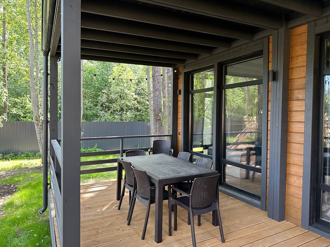 Кухня, посуда, обеденный стол, стулья, диван, 2 кровати-трансформер, прикроватные тумбы, душевая кабина, раковина, унитаз, терраса с уличной мебелью, на территории дома: газовый гриль, мангал, купель