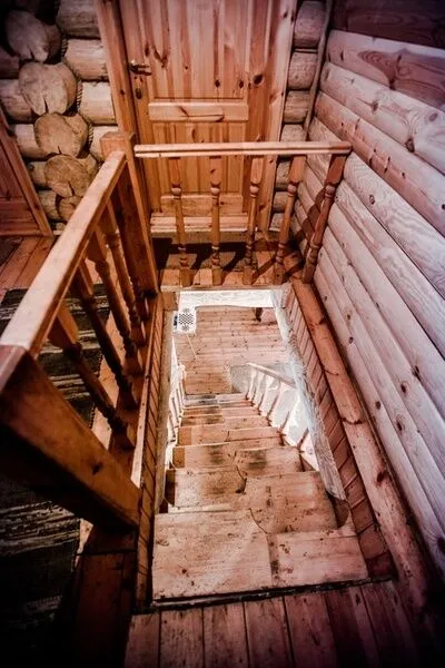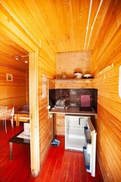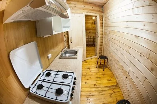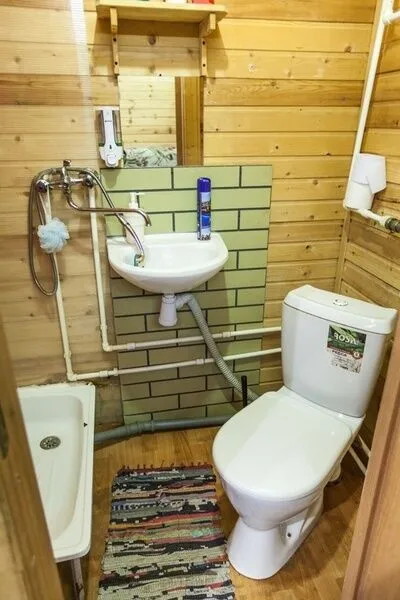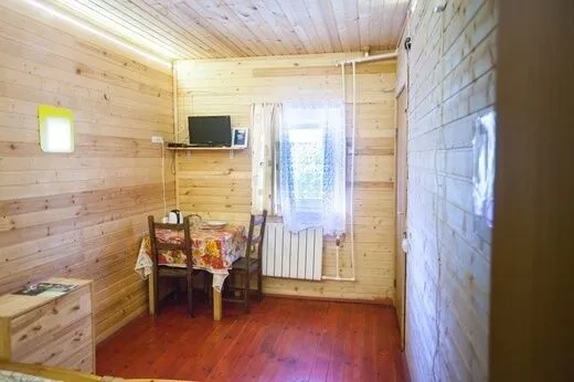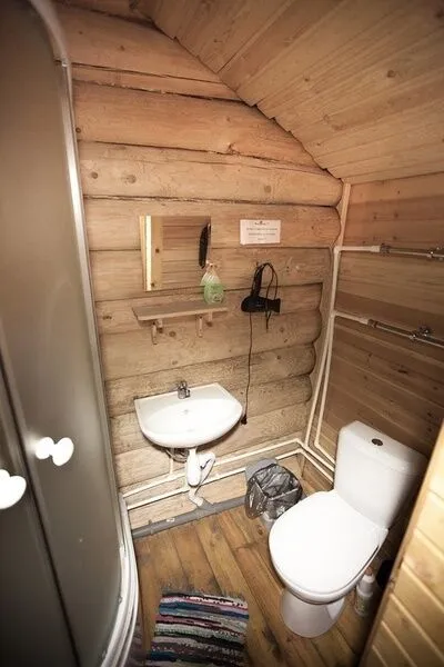 В комнате на первом этаже размещен диван, на втором – две односпальные кровати. Туалетная комната оснащена душем, раковиной, унитазом. В номере есть горячая и холодная вода, отопление.
