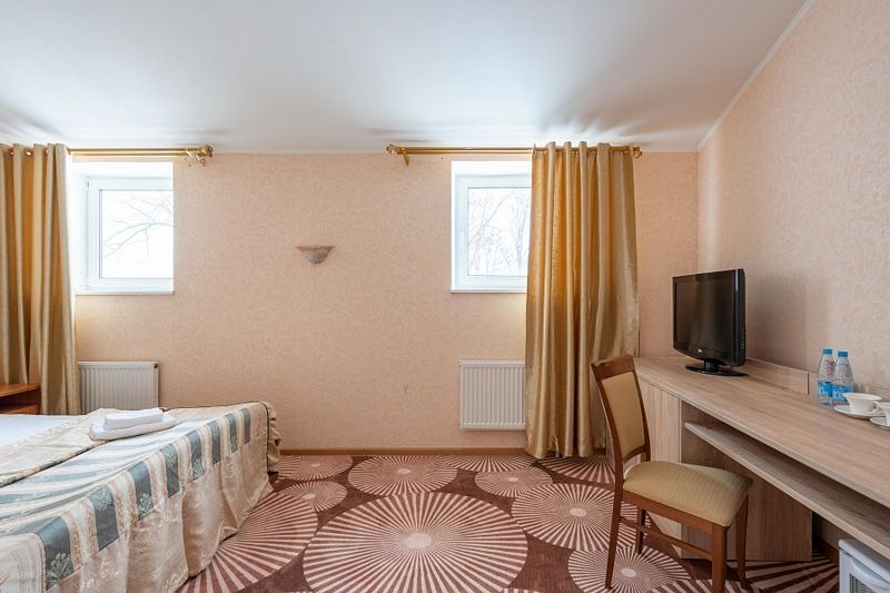 Номер Эконом идеально подойдёт для комфортного размещения двух гостей, ценящих идеальное соотношение цены и качества. Внутри расположены две односпальные кровати с прикроватными тумбочками, вместительный шкаф, телевизор, чайник и оборудованная уборная.