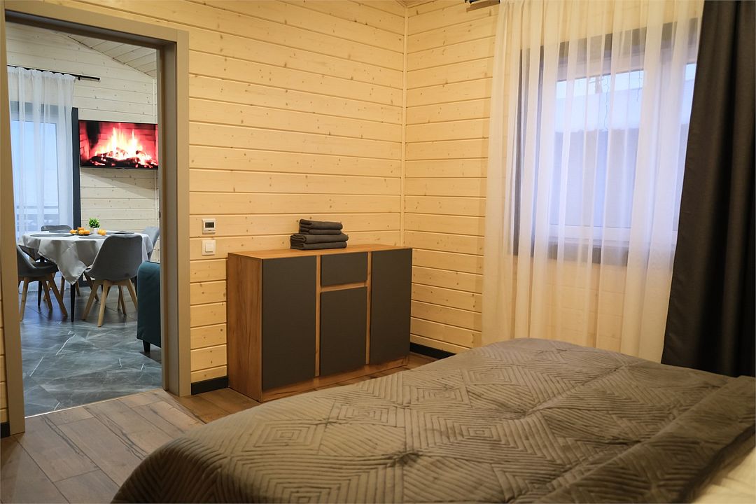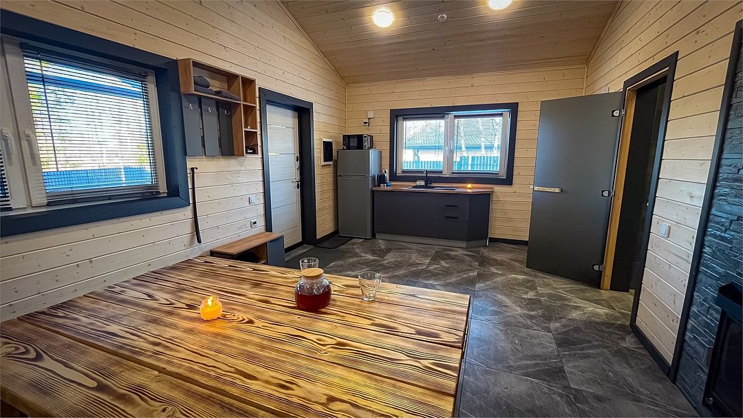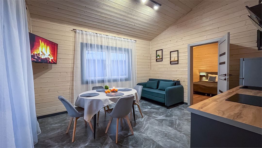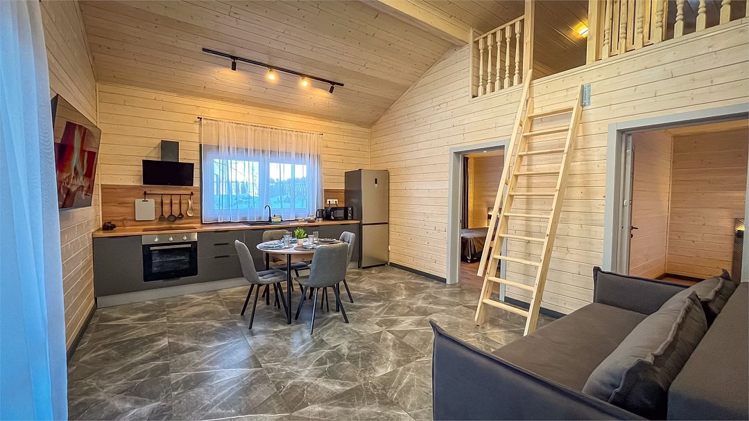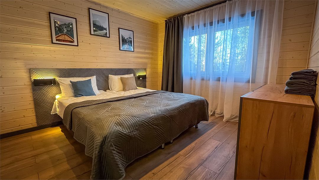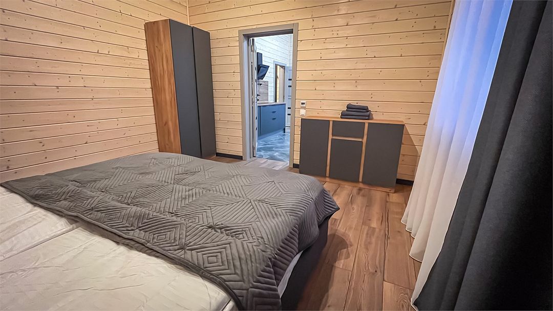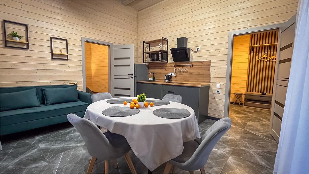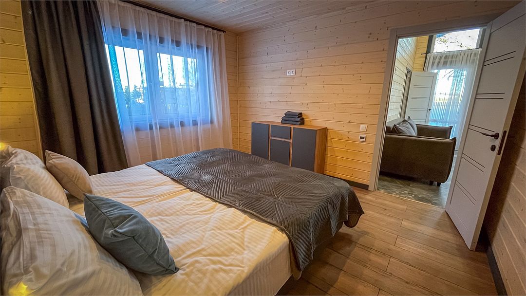 Здесь вас ждет просторная гостиная-кухня, где вы сможете готовить любимые блюда и собираться всей семьей или компанией друзей за просмотром фильма. А после насыщенного дня, проведённого на свежем воздухе, вас ждёт комфортная спальня с двуспальной кроватью для сладкого сна и полноценного отдыха.
