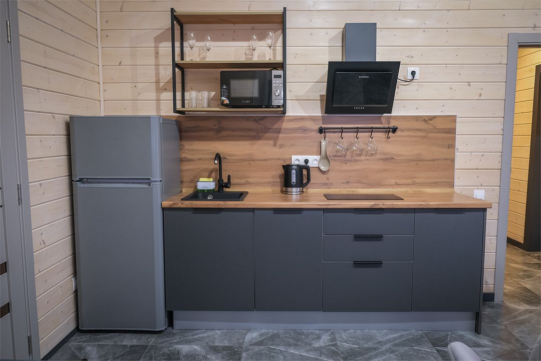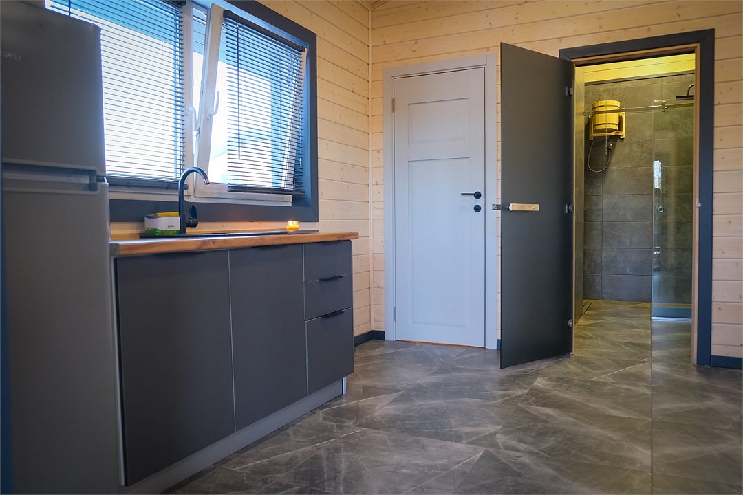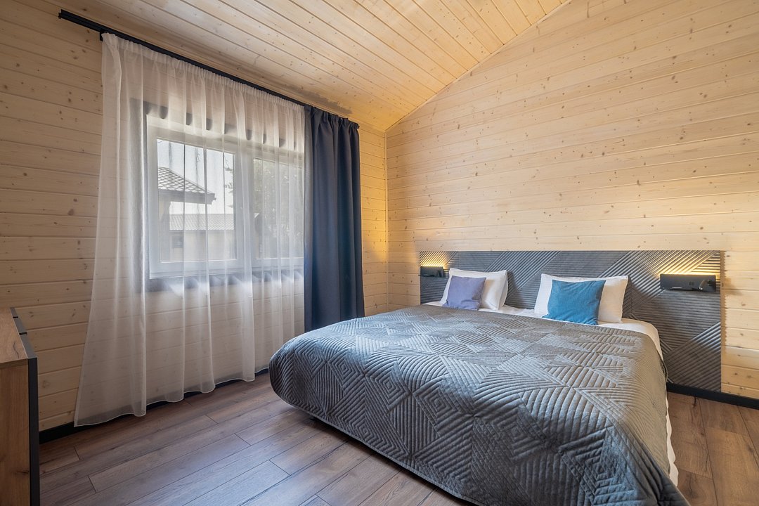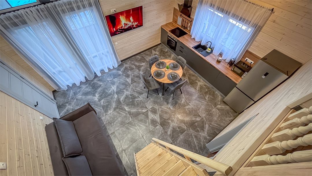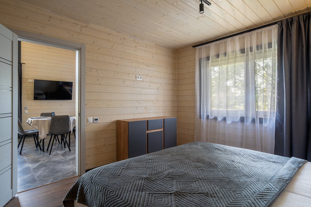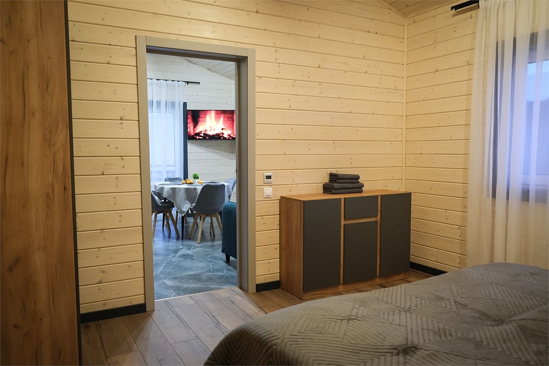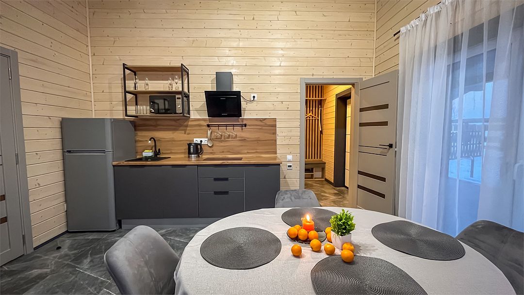 Здесь вас ждет просторная гостиная-кухня, где вы сможете готовить любимые блюда и собираться всей семьей или компанией друзей за просмотром фильма. А после насыщенного дня, проведённого на свежем воздухе, вас ждёт комфортная спальня с двуспальной кроватью для сладкого сна и полноценного отдыха.