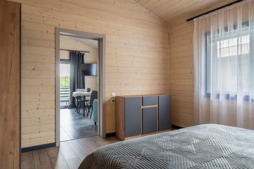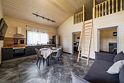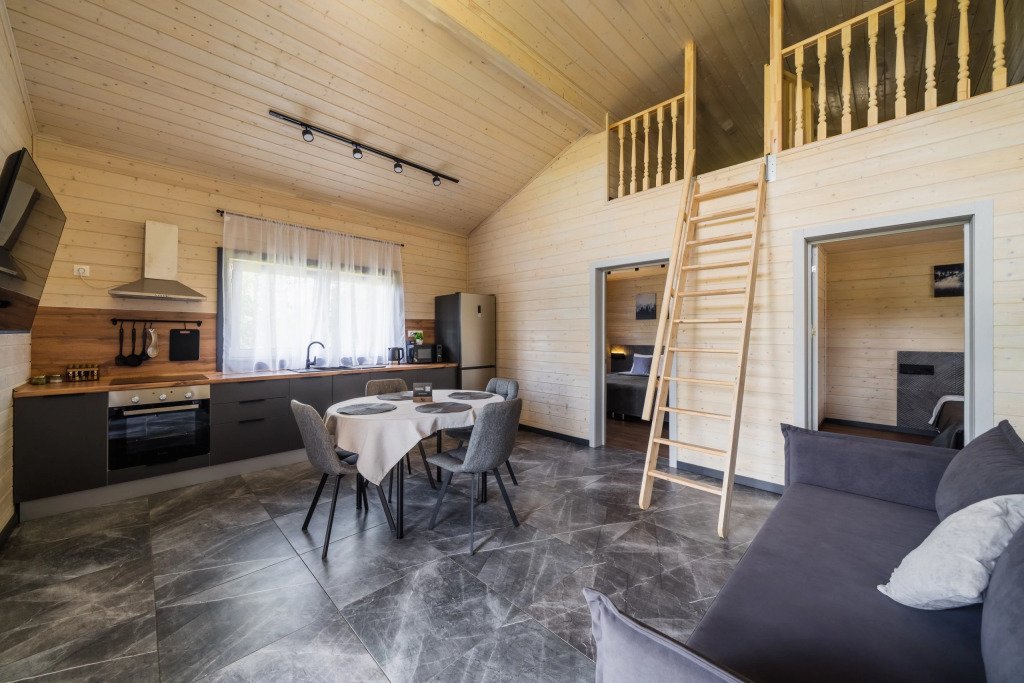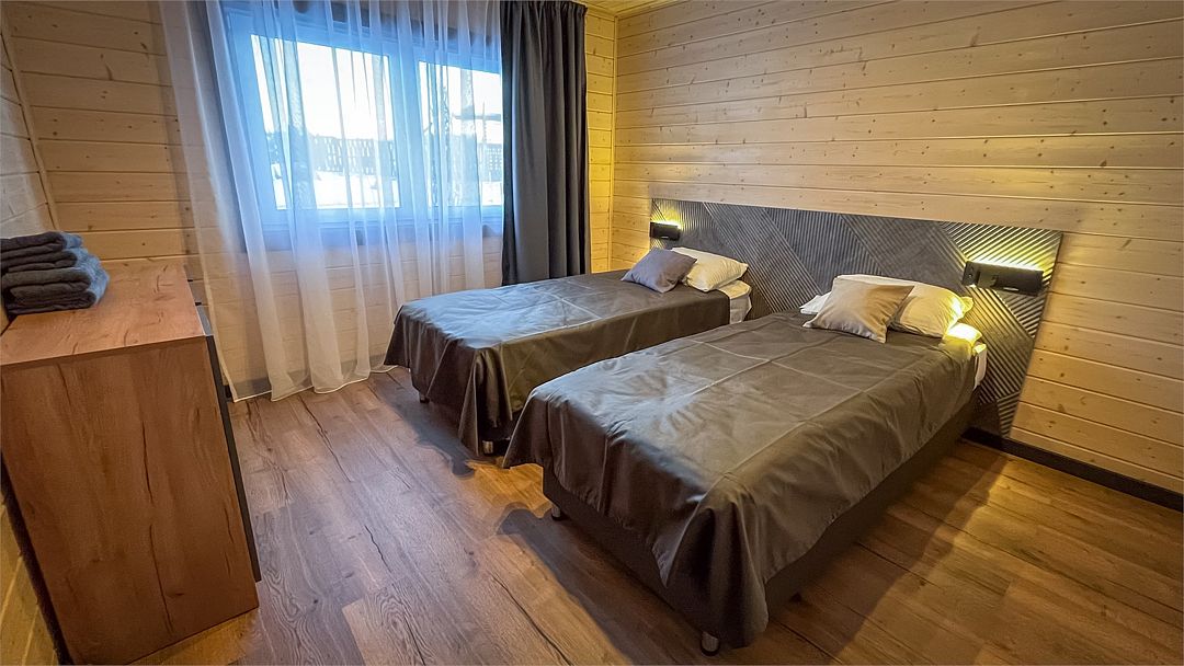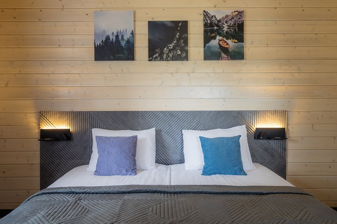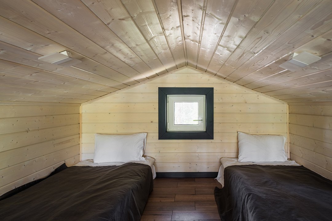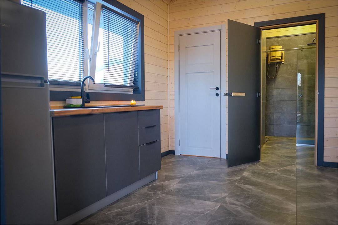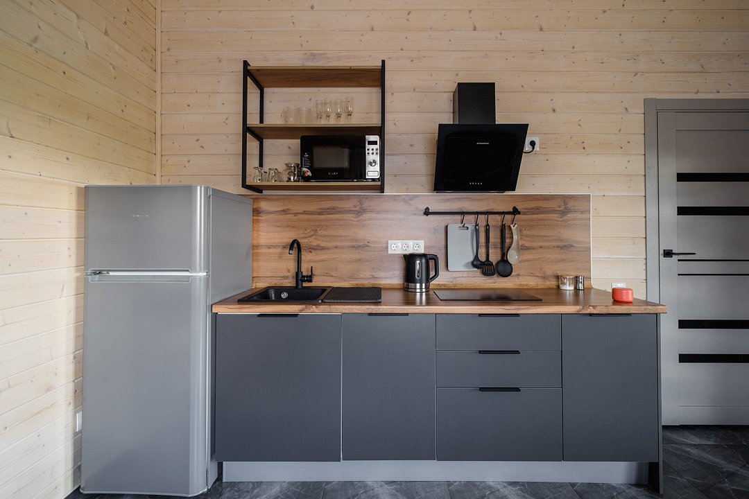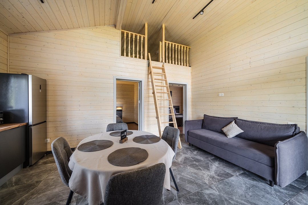 Здесь вас ждет просторная гостиная-кухня, где вы сможете готовить любимые блюда и собираться всей семьей или компанией друзей за просмотром фильма. А после насыщенного дня, проведённого на свежем воздухе, вас ждёт комфортная спальня с двуспальной кроватью для сладкого сна и полноценного отдыха.