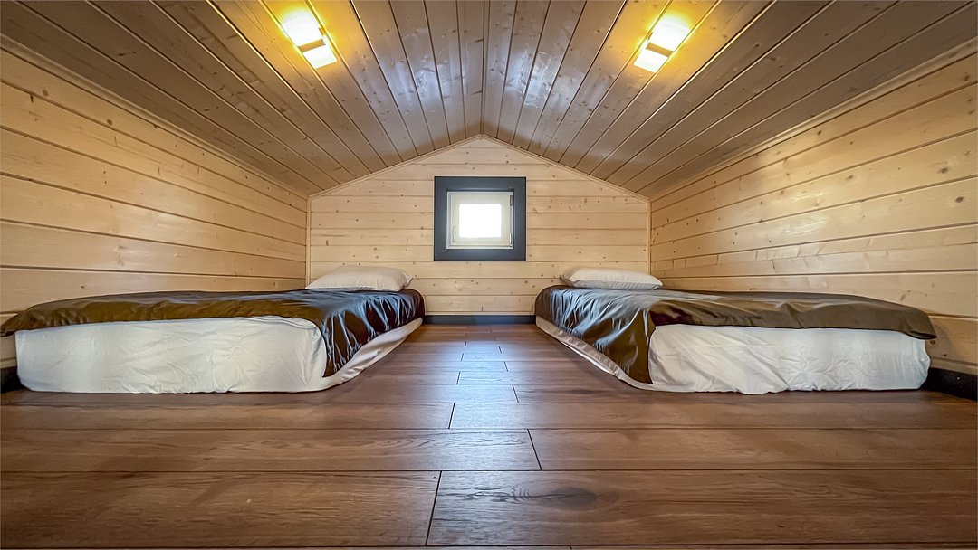 - Второй этаж (мансардный) дома оборудован двумя матрасами со спальными местами.