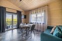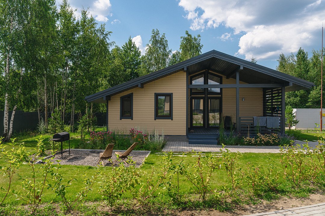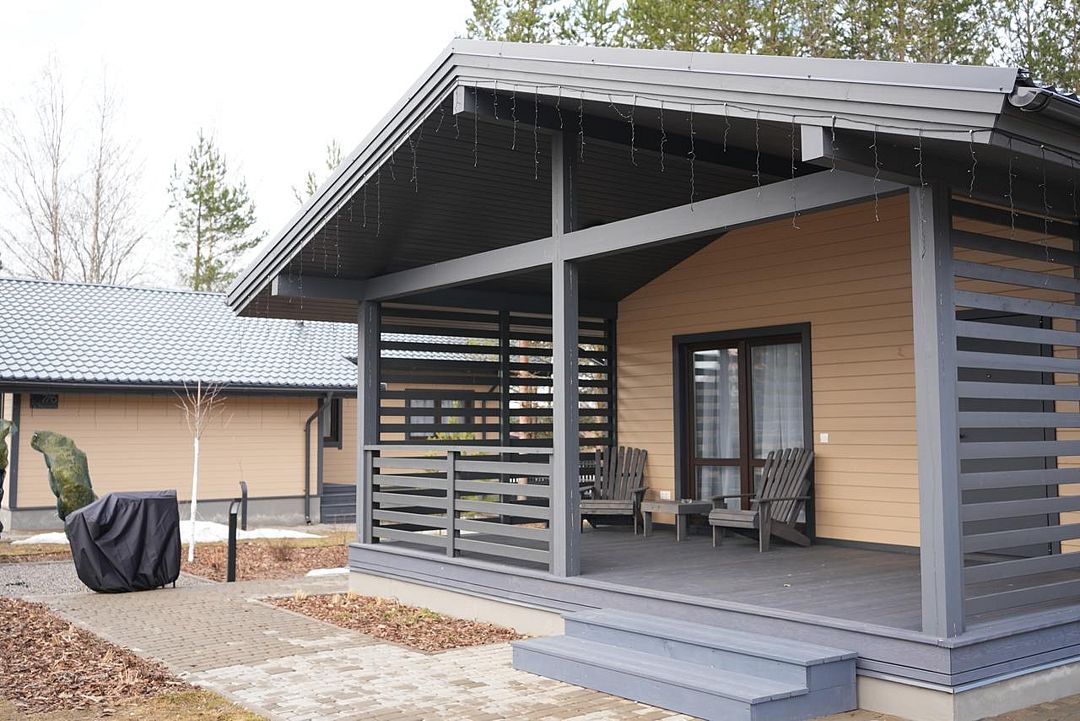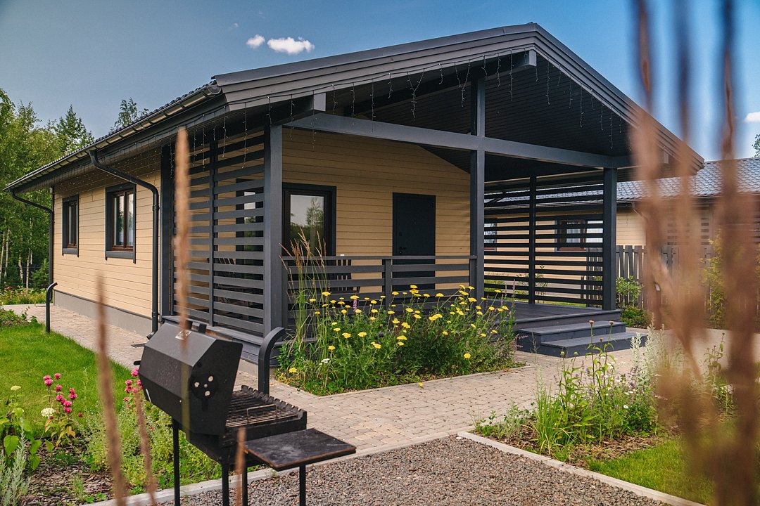 Прекрасный домик "Оптима" со спальней и кухней-гостиной. Насладитесь потрясающим видом на лесной массив с просторной террасы, приготовьте вкусный ужин на мангале и расслабьтесь в собственной сауне