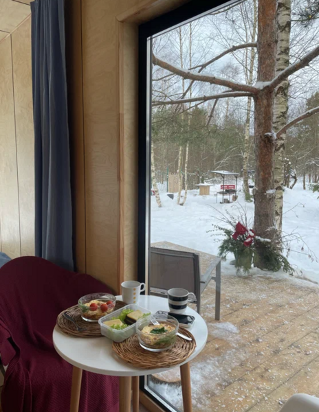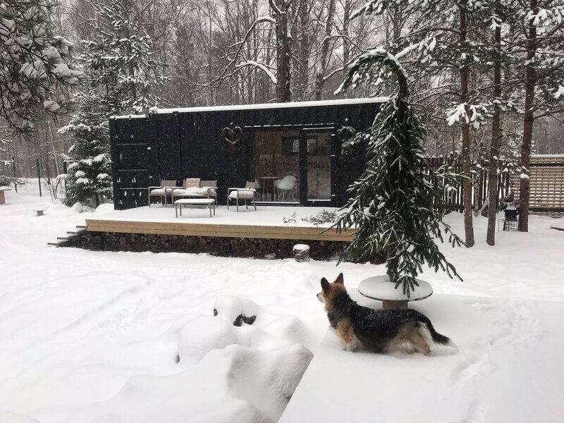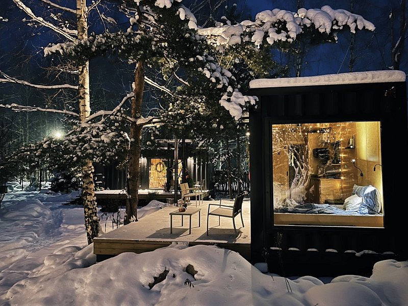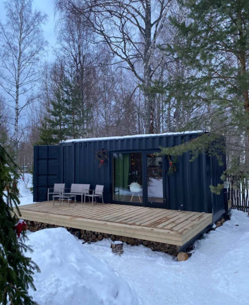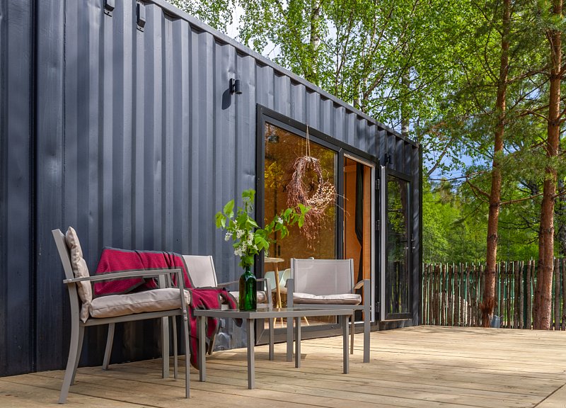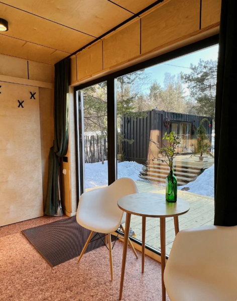 Домики из морских контейнеров выполнены в минималистичном стиле в концепции tiny house. Внутри спальная зона с большим панорамным окном, рабочая зона, кухня со всем необходимым, личная ванная комната. У каждого домика есть личная терраса. Есть гриль-зона, к которой имеют доступ все гости, где можно приготовить ужин, погреться у костра. Шампура и решетка предоставляются бесплатно, а уголь, дрова и розжиг платно.