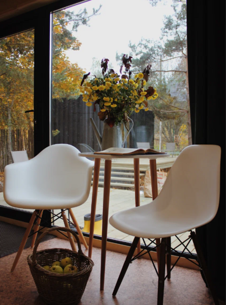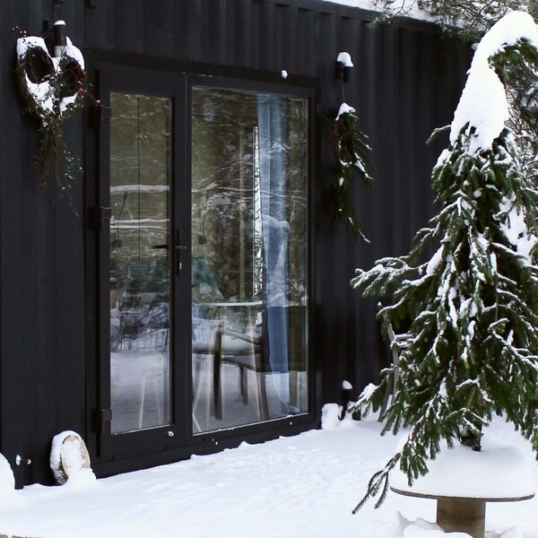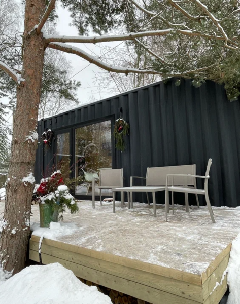 Домики из морских контейнеров выполнены в минималистичном стиле в концепции tiny house. Внутри спальная зона с большим панорамным окном, рабочая зона, кухня со всем необходимым, личная ванная комната. У каждого домика есть личная терраса. Есть гриль-зона, к которой имеют доступ все гости, где можно приготовить ужин, погреться у костра. Шампура и решетка предоставляются бесплатно (по запросу), а уголь, дрова и розжиг платно.