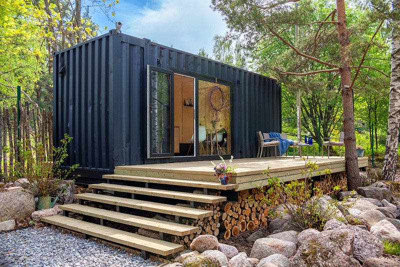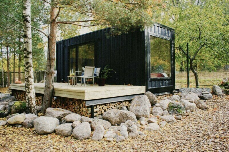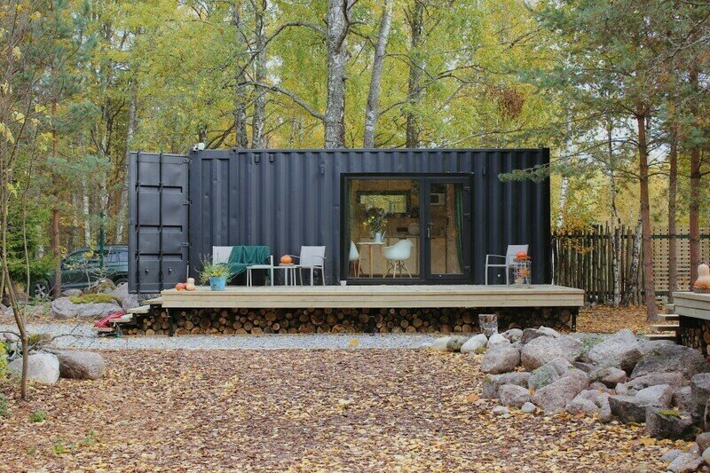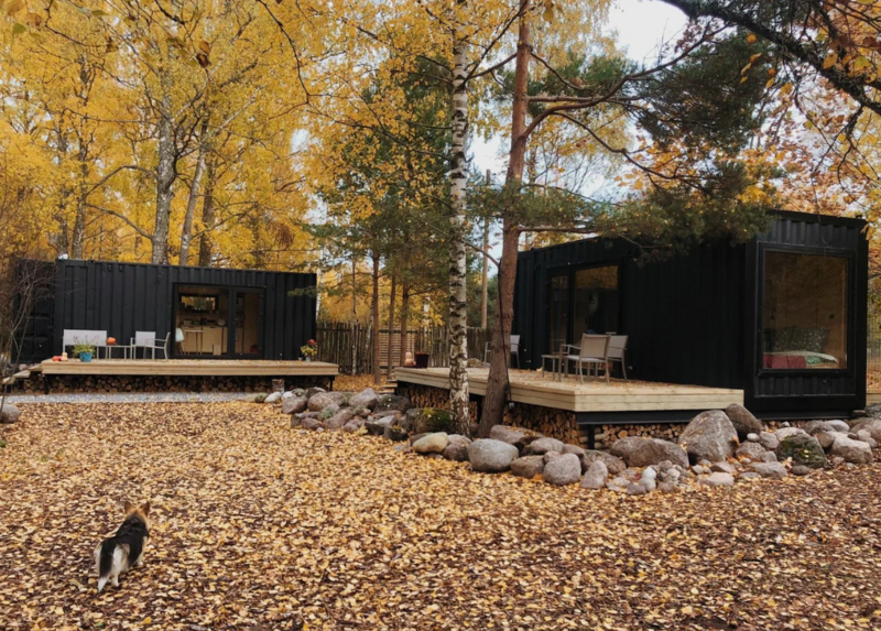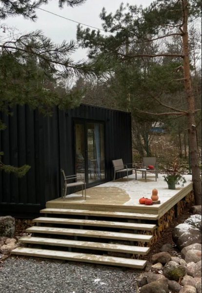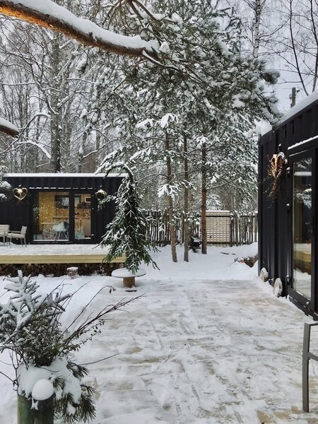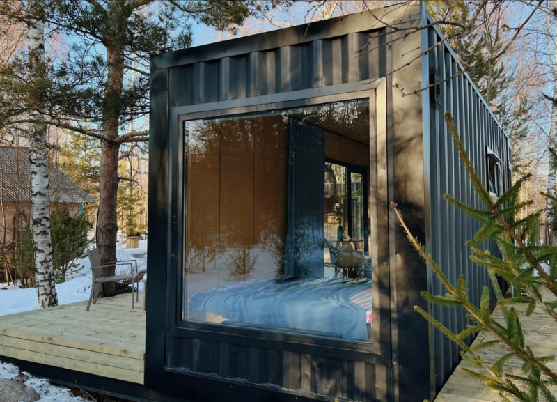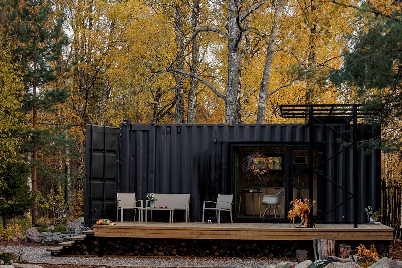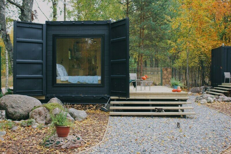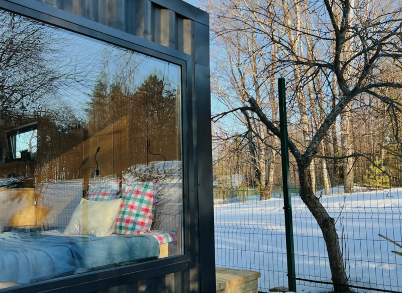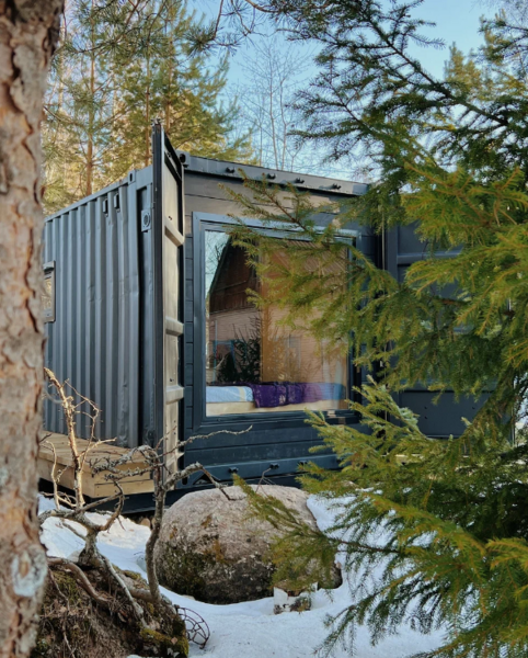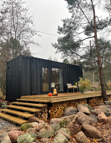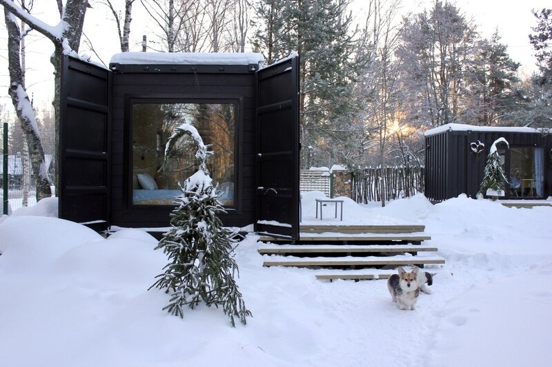 Домики из морских контейнеров выполнены в минималистичном стиле в концепции tiny house. Внутри спальная зона с большим панорамным окном, рабочая зона, кухня со всем необходимым, личная ванная комната. Есть личная терраса. Гриль-зона, к которой имеют доступ все гости, где можно приготовить ужин, погреться у костра.