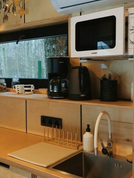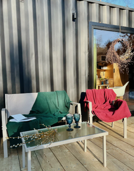 Для проживания доступны два морских контейнера, оборудованных всем необходимым. спальной и рабочей зонами, обставленной кухней с посудой, чаем, кафе и печеньем, санузлом с душевой кабиной и большой террасой с мебелью.