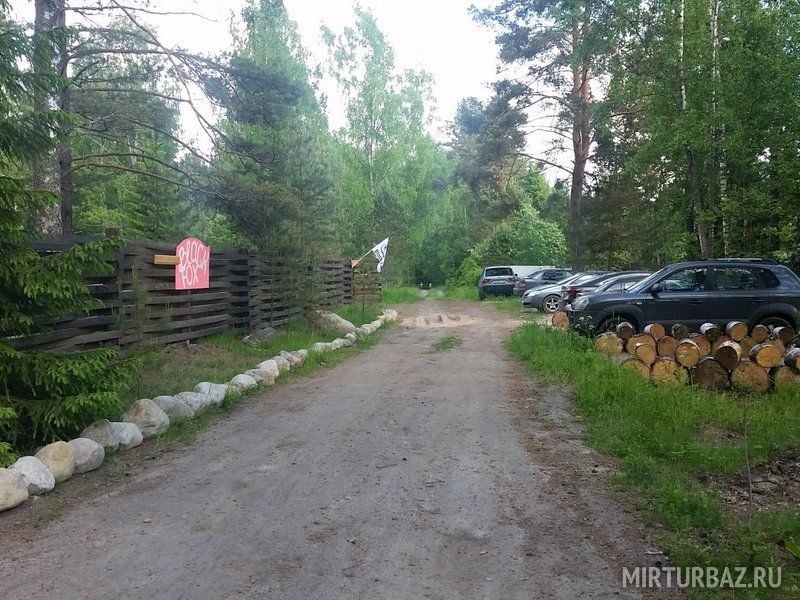Двигаясь по Выборгскому шоссе (трасса Скандинавия) перед столбиком дорожных указателей километража на 99 км необходимо повернуть налево и далее 6 км по лесной дороге. Придерживаясь красных указателей.