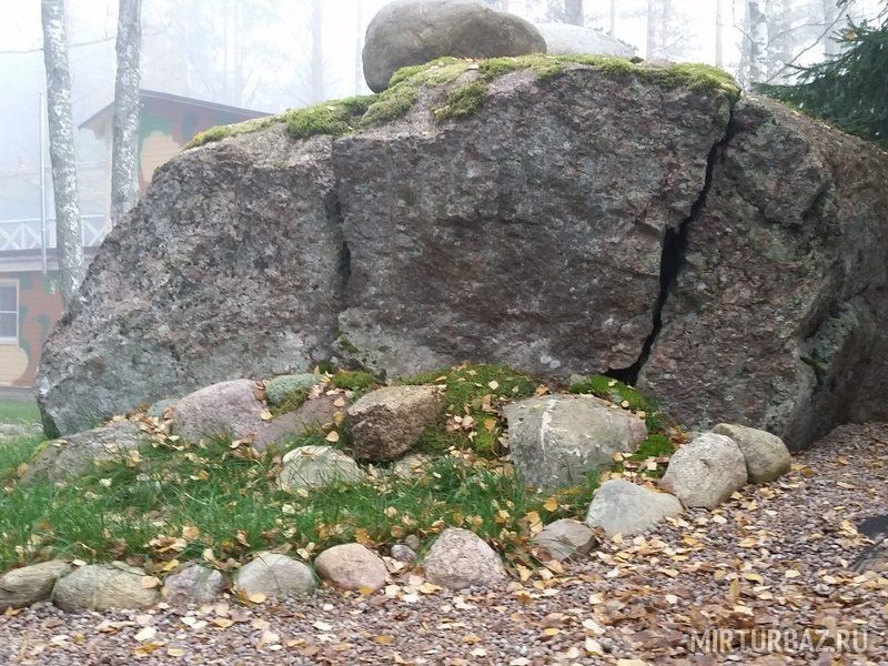 Двигаясь по Выборгскому шоссе (трасса Скандинавия) за столбиком дорожных указателей километража на 110 км необходимо повернуть направо и далее 6 км по лесной дороге. Придерживаясь красных указателей.