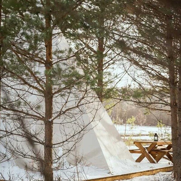 «Индейская юрта» на берегу реки с костровищем внутри, можно посидеть у костра с близкими.