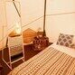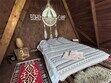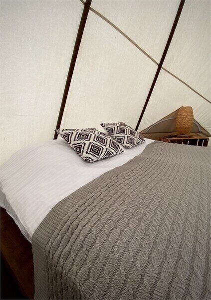 Внутри шатра удобная кровать, тёплые пледы, постельное белье и полотенца.