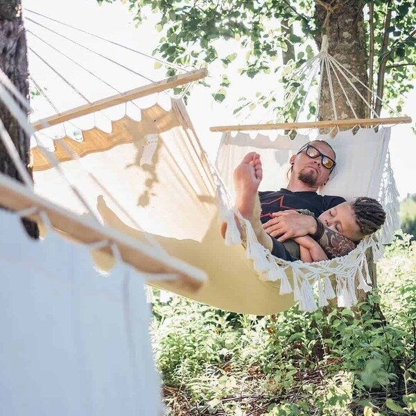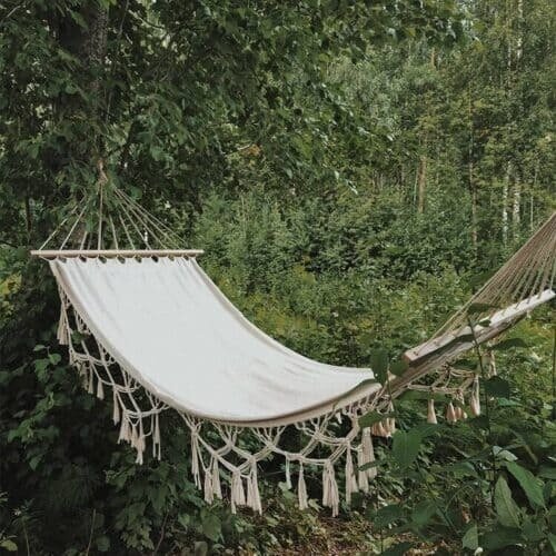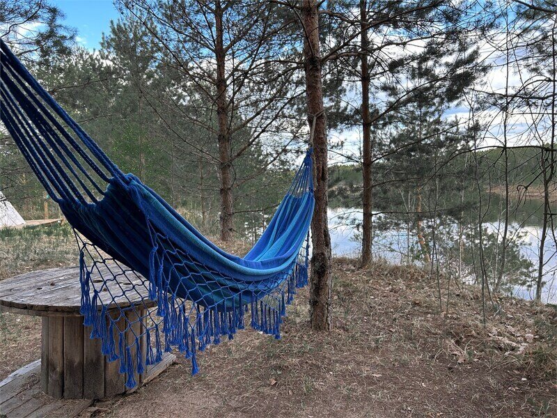 Для полноценного отдыха в кемпинге в тени деревьев обустроена зона с гамаками и качелями.