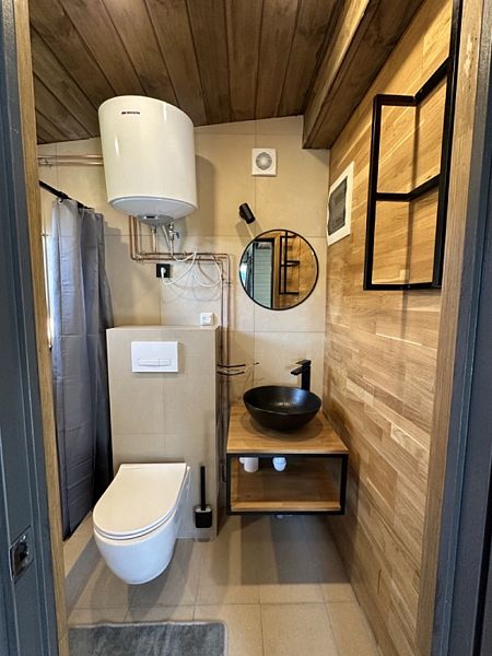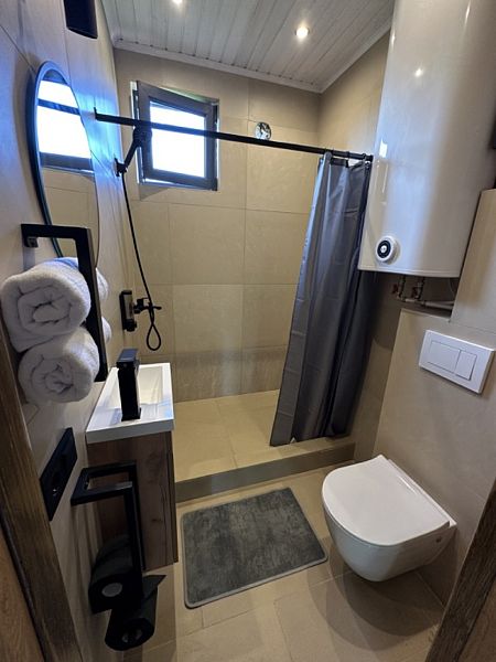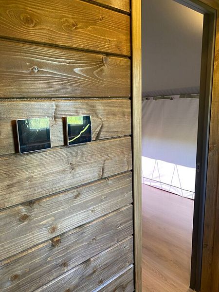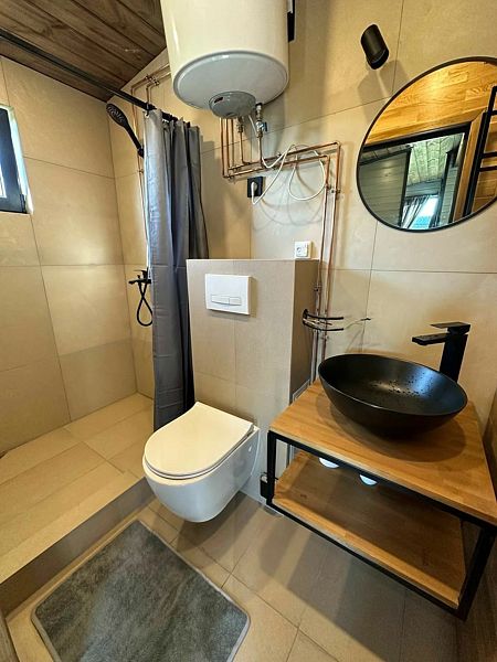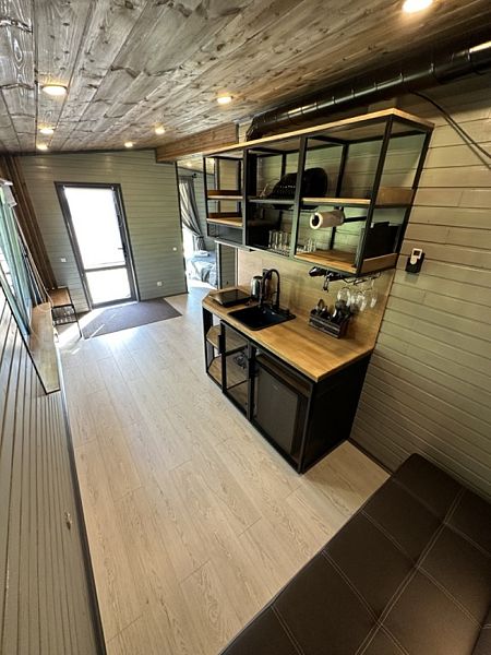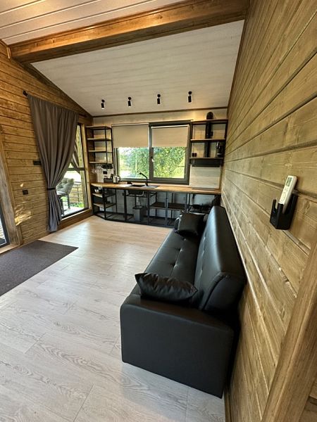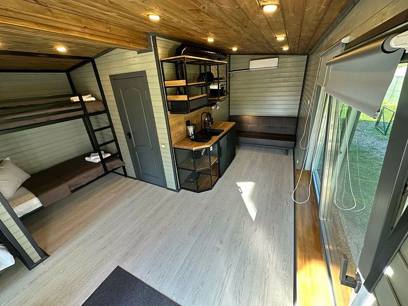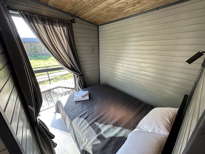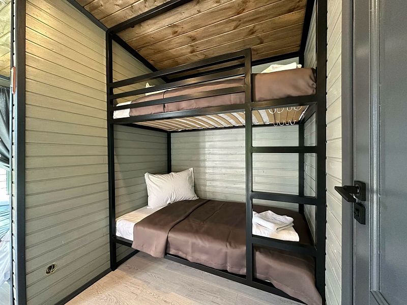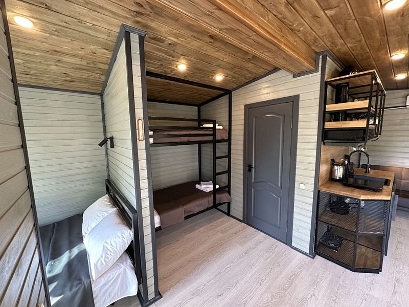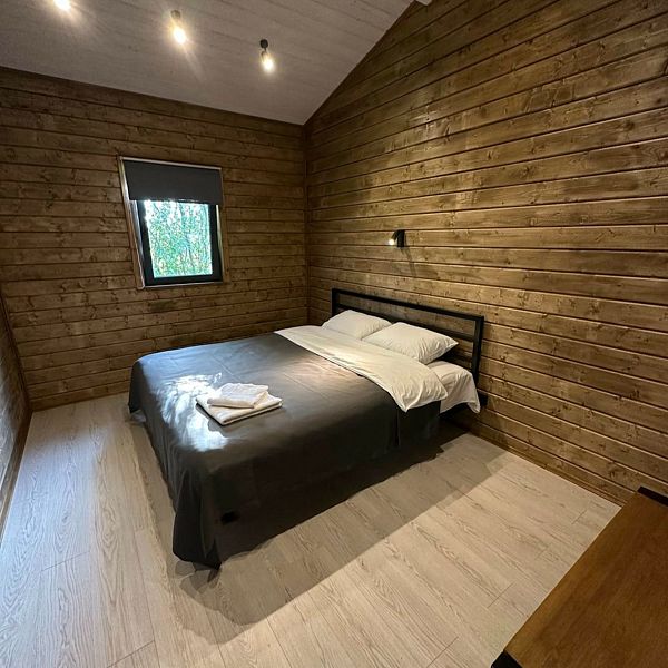 Панорамное остекление, теплый пол, большая кровать, двухъярусная кровать детская, диван-кровать, кухня. Ванная комната: душевые принадлежности, туалет в номере, гель для душа, шампунь, полотенца, белье, фен.