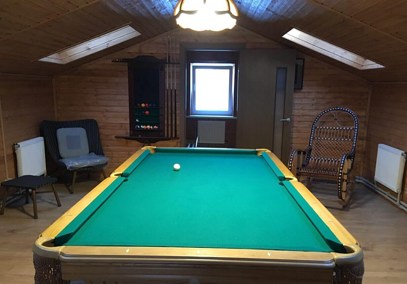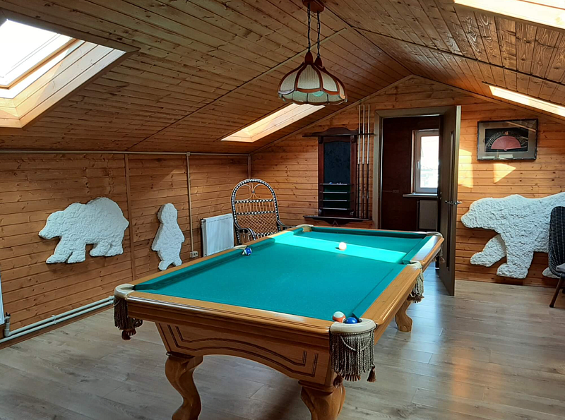 Находится на втором этаже бани в зоне отдыха. Бильярд можно арендовать отдельно (без бани).