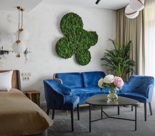 Спальная комната, декорированная сублимированным мхом для создания особого уюта, просторная гостиная с комфортабельной мебелью и личная открытая терраса. Роскошный отдых в стиле Люкс и ничего лишнего.