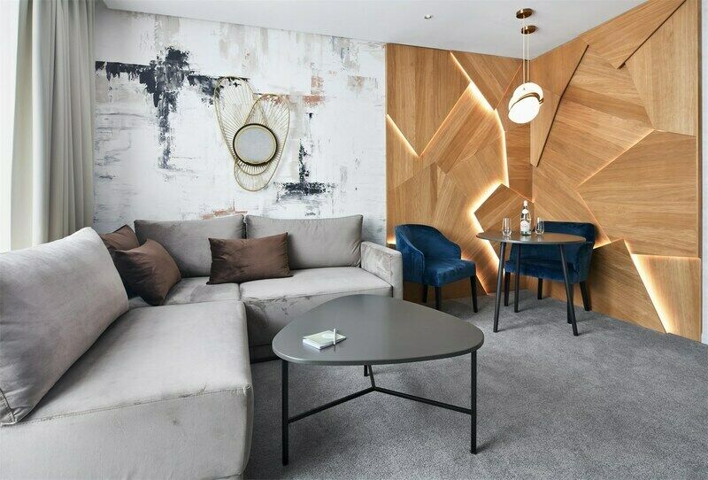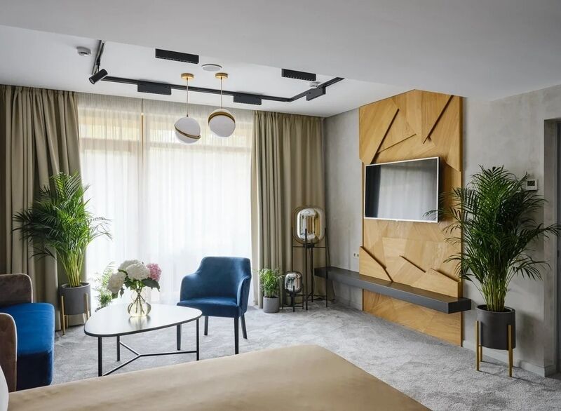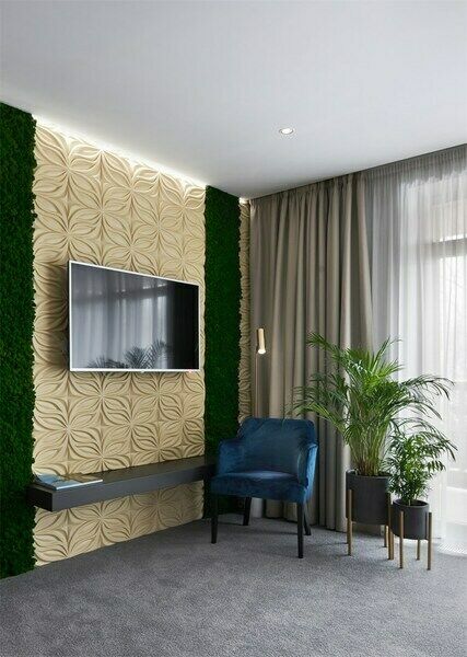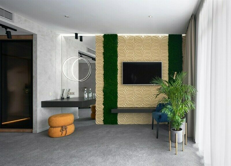 2 комнаты настоящей роскоши в стиле постмодерна. Элементы декора, выполненные из живого сублимированного мха, самое современное оборудование, большие окна, ванная, приватная терраса, очень много света и истинная атмосфера домашнего тепла — вот что вас ждет при выборе номера Супер Люкс.